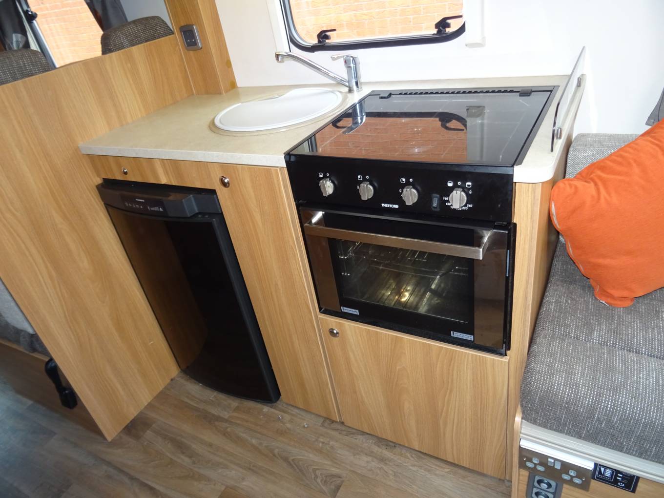 with chrome mixer tap and a Dometic three-way powered fridge with icebox, plus