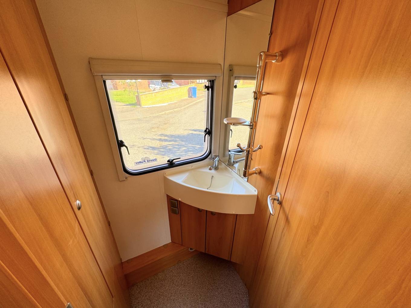 The rear washroom offers a separate shower, toilet cassette, hand wash basin, and large wardrobe. For added privacy, the door closes off the living area, creating a private dressing room.