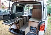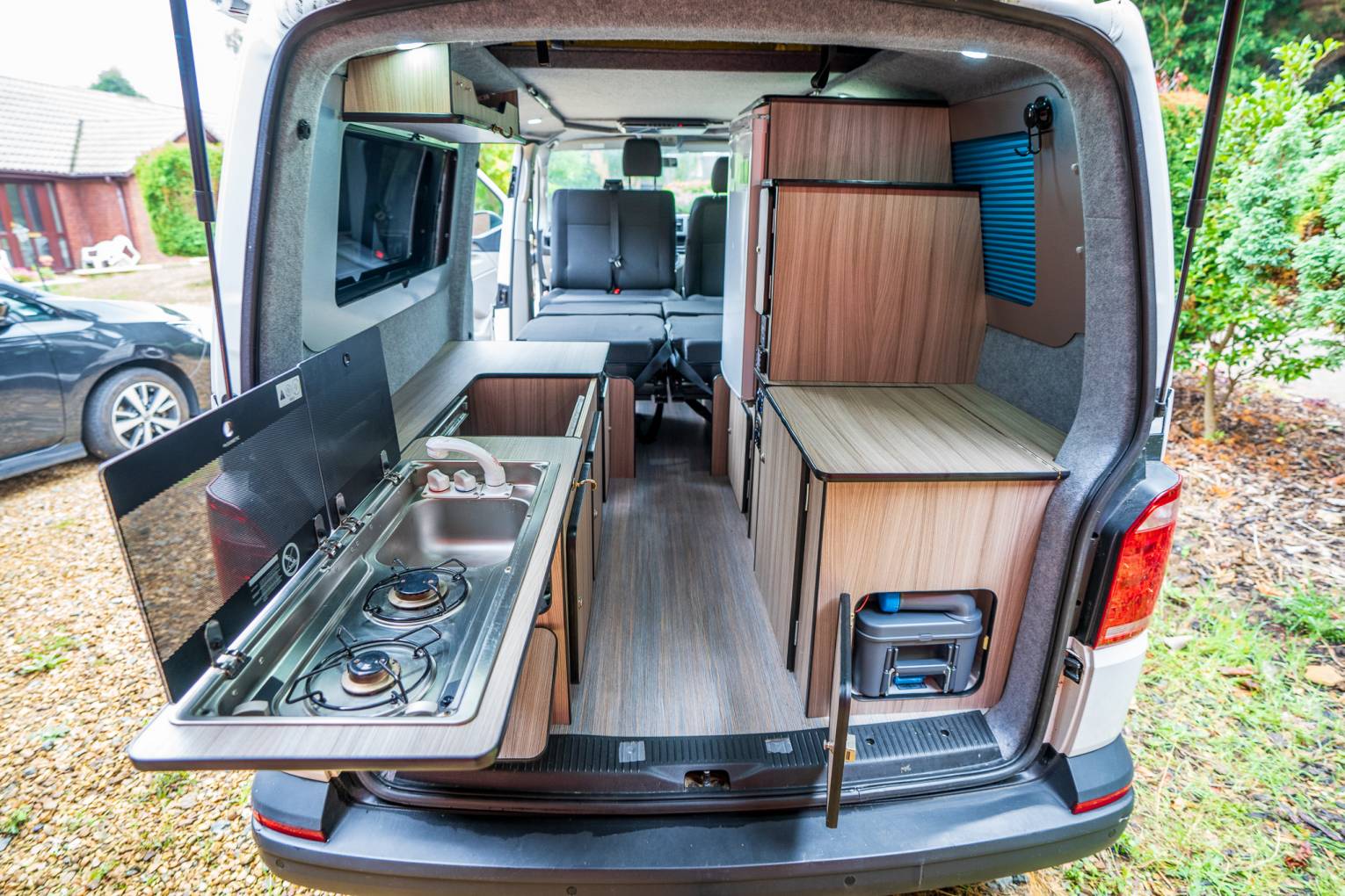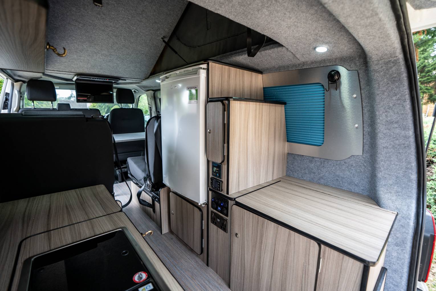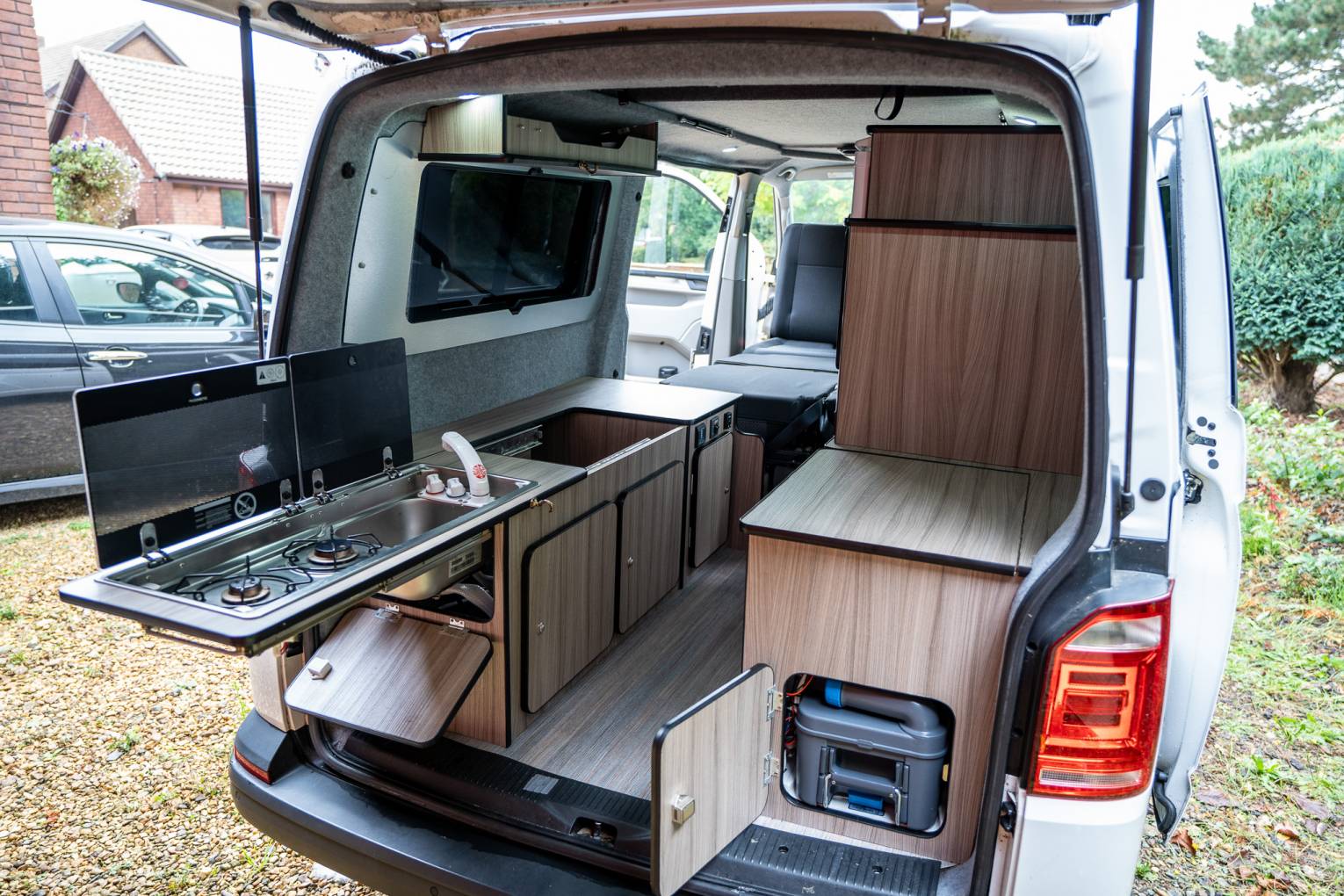 The unique kitchen in the back, comes with pull out Gas hobs and a retractable sink/tap, Full sized 82L L.E.C Fridge Freezer, and a convenient shower fitting on the rear hood, so you can have those much needed off-grid clean ups. The rear of the vehicle comes with a complete Thetford Toilet and Cassette, so you'll never have to sacrifice convenience for space in this unique VW. For entertainment, this vehicle comes fitted with a 17.3 Inch 1080 Full HD Car Roof Flip Monitor, so you'll never be left missing your favourite shows, or news, and plenty of storage space for sports equipment, campervan essentials or even just your favourite tipple. This is all powered by 2 Exide Dual AGM Leisure Batteries (800KW each) and an inverter, perfect to keep you powered up off-grid.