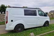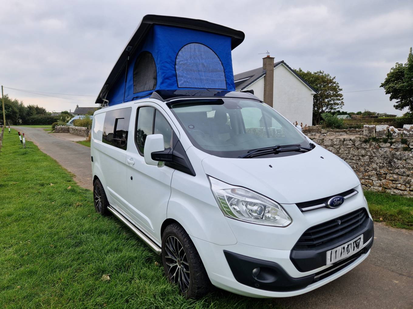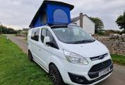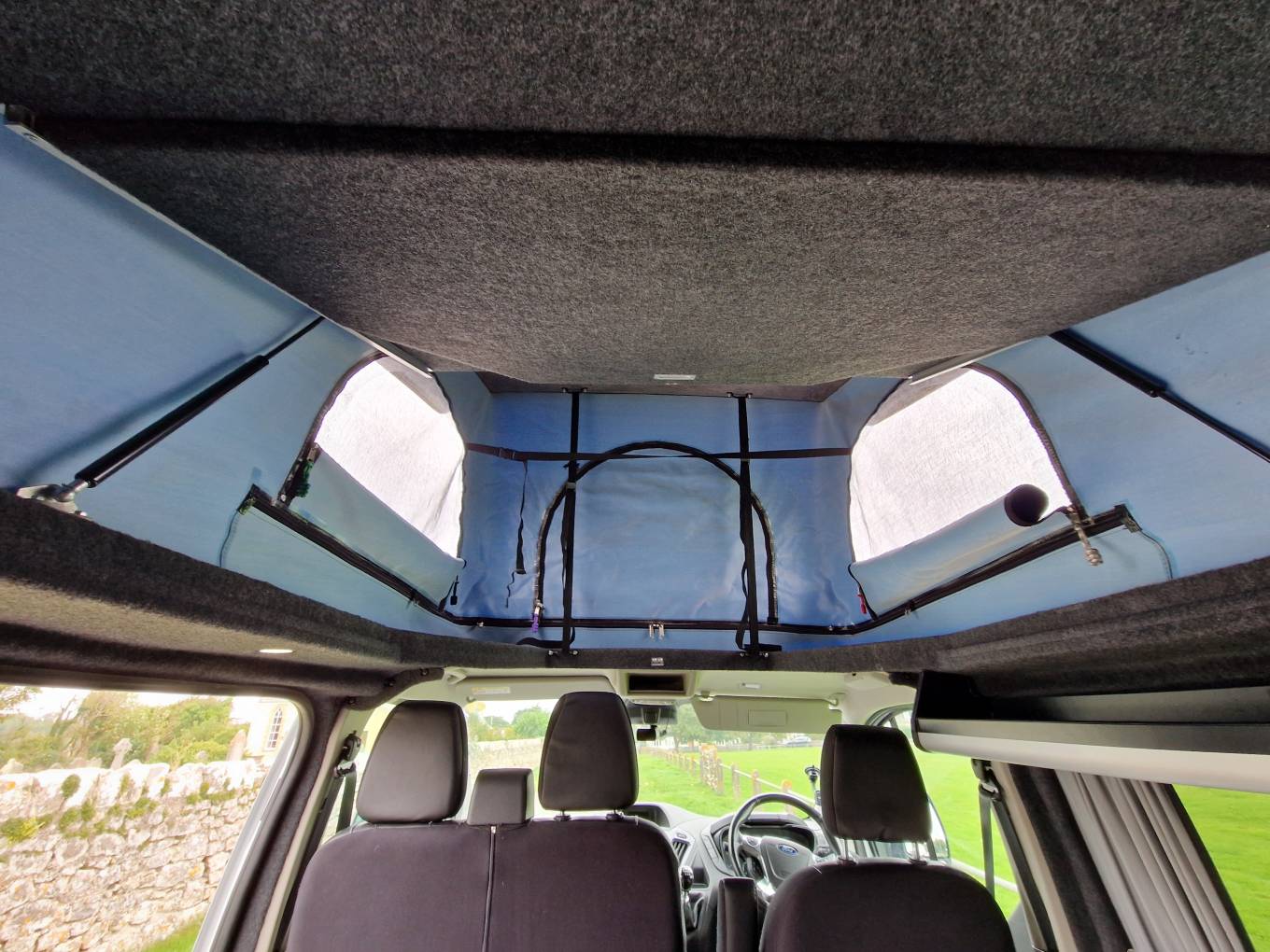 The first thing to note is this Transit has 3 extras we consider to be very important for campers - It has a Solar Panel,diesel heater and off-road tyres which allows the van to have excellent off-grid capability and great handling for those who want to go wild camping. The Skyline Poptop is particularly convenient as the "floor" is on hydraulic stays so can be raised very easily giving convenient standing room in the main habitation area of the camper rather than having to remove loose boards and then find storage space for them. This poptop also comes with front and side windows and fly screens and a mattress topper.