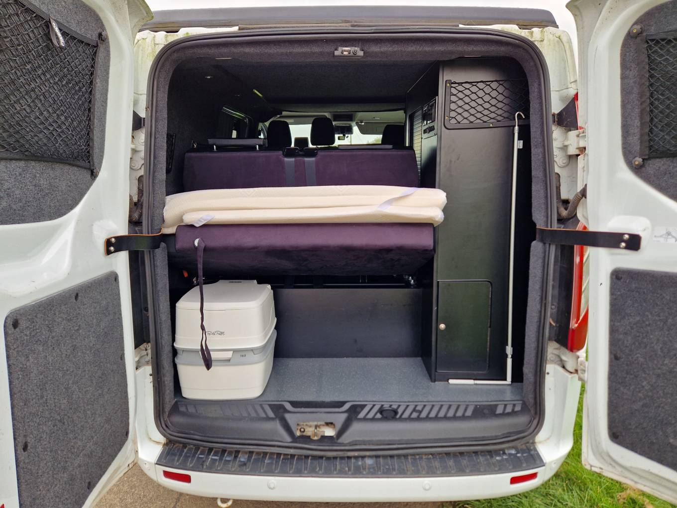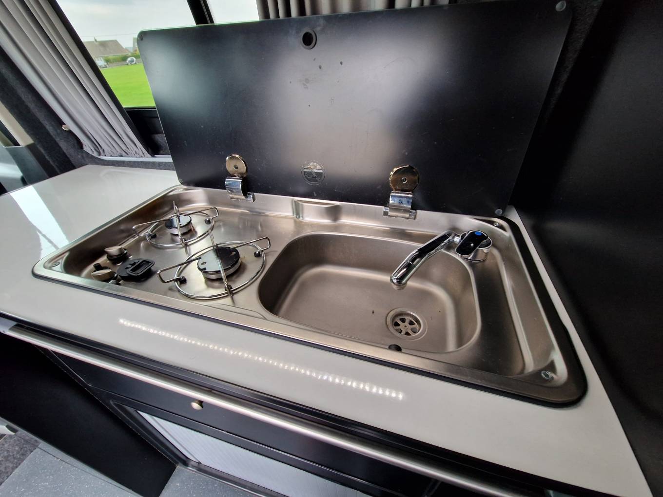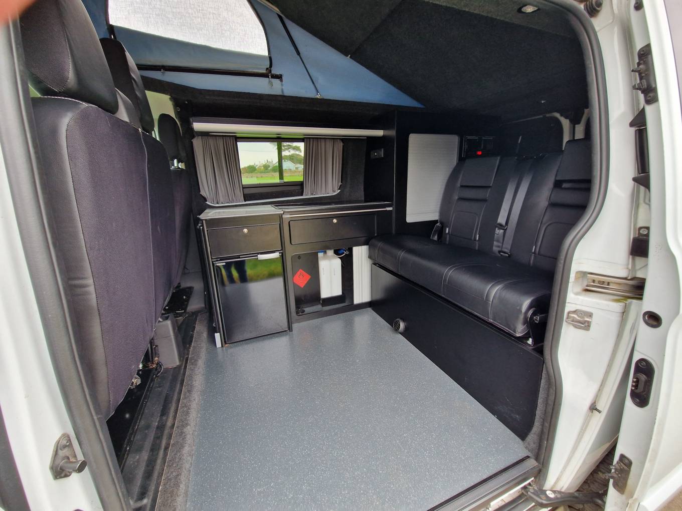 The Rock n Roll bed is a Rib Alt Air and has 2 seatbelts and is easily made up to a double with storage space underneath and you have an additional 2 sleeping places in the pop top. The front cab passenger seat swivels round to give you extra space for dining along with the removable table. Kitchen is fully functional with a 2 burner gas hob, sink and a fridge with freezer box. At the rear of the campervan you have more storage space and there is a Porta Potti on board.