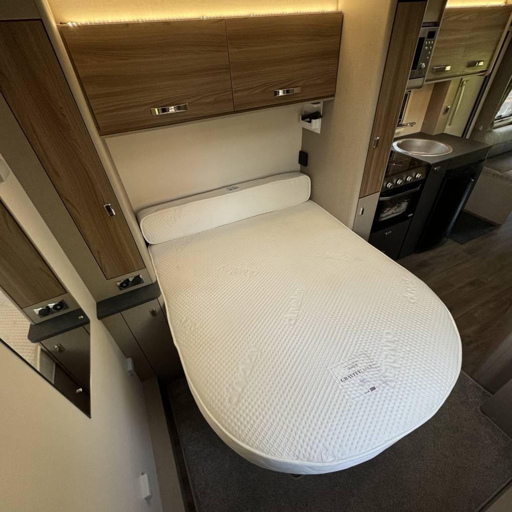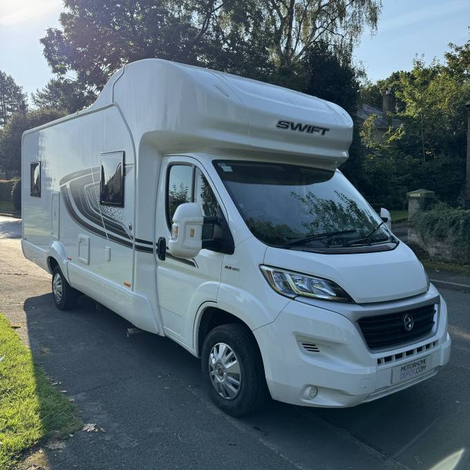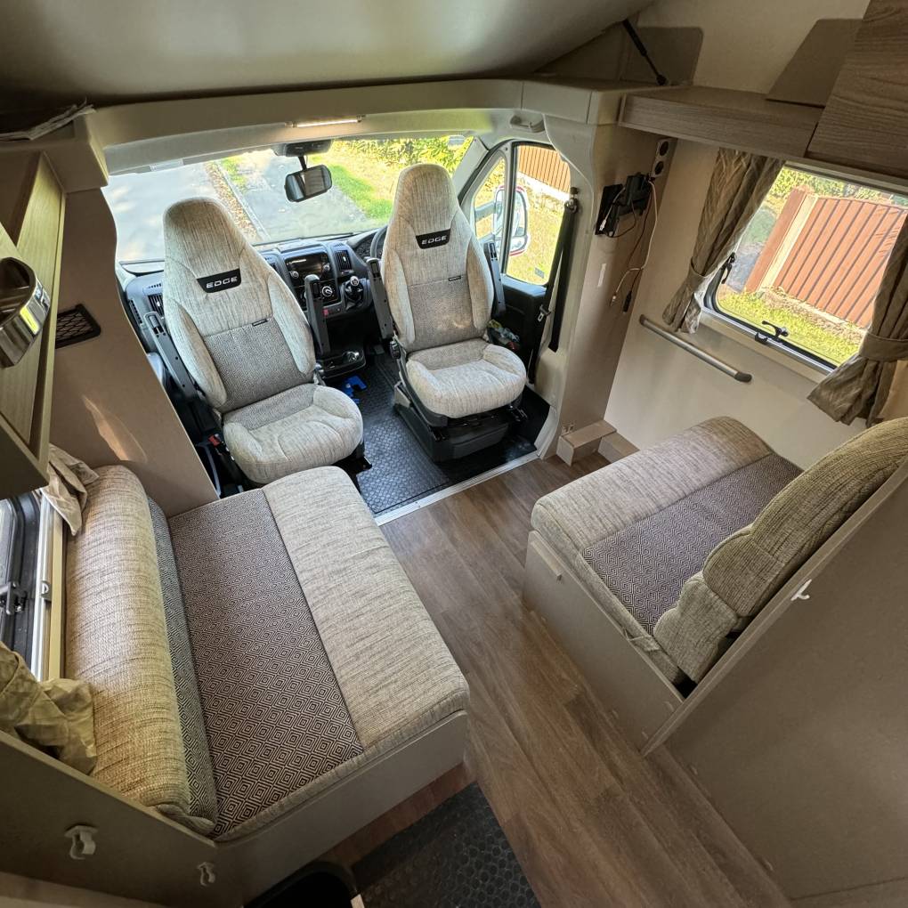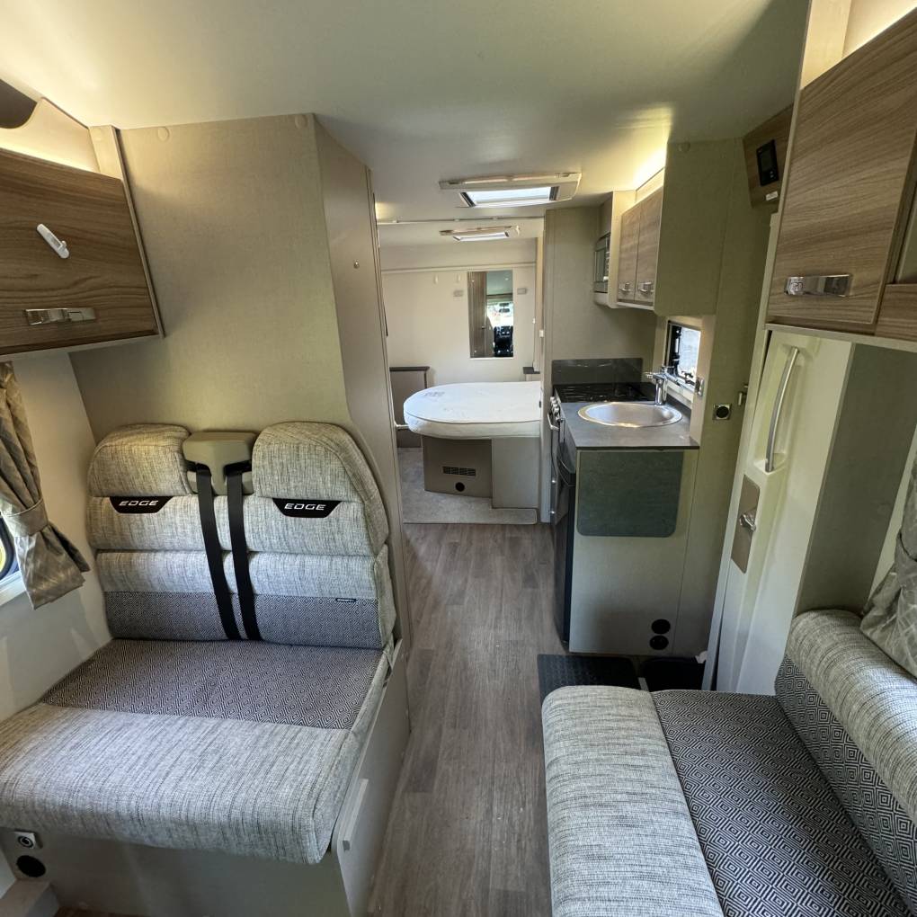 Welcome to the sale of this stunning Swift Edge 494. Travelled only 5,032 miles since it’s registration in September 21. The Edge 494 is perfect for a family of four or a couple as it benefits from a fixed bed to the rear and a living area to the front near the cab. The front lounge is made up of 2 rear travelling seats, a side bench and the front captain chairs which create a spacious area for up to 6 people! Over the cab you will find a large double bed, which is accessible by a ladder and don’t interfere with the living area if other people were relaxing in the night-time. To the middle you will find all home comforts which include an Oven, Grill. Hob with 3 Gas Burners and 1 Electric Hob, under counter Fridge with Freezer Compartment, Microwave, Worktop Extension and a great amount of storage for your kitchen essentials. The rear bedroom provides you with a stunning transverse island bed configuration!