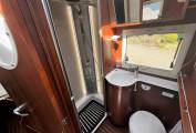 At the rear of the motorhome you will find a spacious rear U shape lounge which is flooded with natural light from the panoramic windows and skylight. This area provides ample seating and is over a large storage garage. As the night draws in, this area easily converts to a generous sized bed. Moving forward you will find the luxurious washroom including a cassette toilet, a fabulous separate shower, stylish vanity unit with sink and plenty of storage. Adjacent is the well equipped kitchen including a microwave, sink with mixer tap, three burner gas hob, extractor fan , full size fridge freezer and ample storage. In the heart of the motorhome you will find the elegant dinette area which can seat up to 6 around the fixed sliding table and is the perfect place to socialise or relax with family and friends. This area effortlessly converts to make a comfortable bed. Above the cab area you will find a double bed which can be lifted to make extra head room in the cab. This completes the 6 berth motorhome.