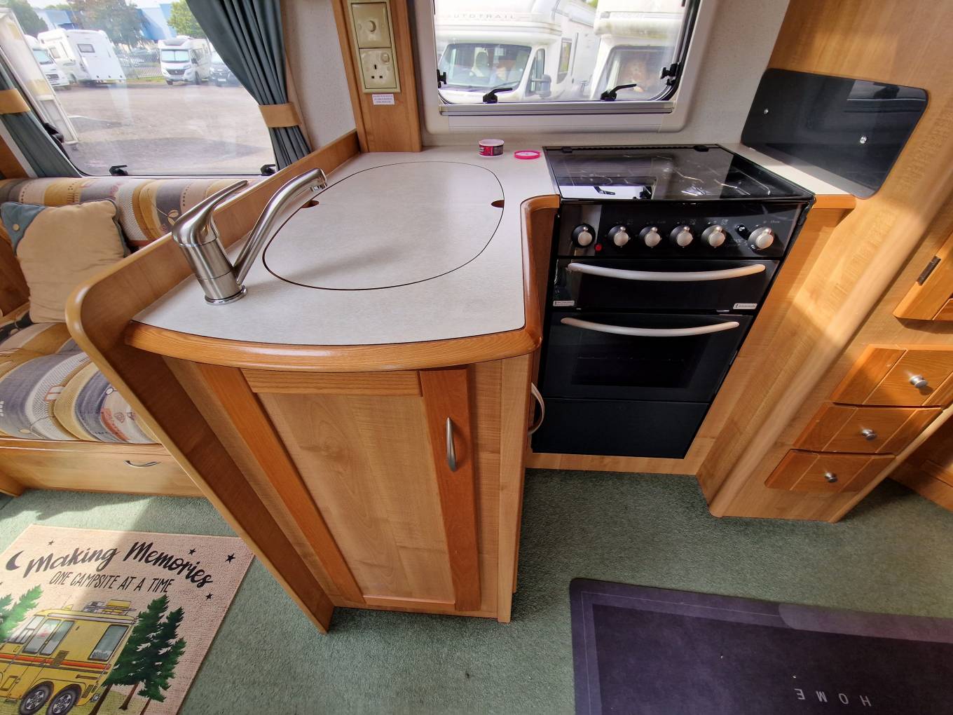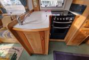 The kitchen is behind the Centre Dinette Area and across from the habitation door which allows extra ventilation when cooking a hearty meal for any occasion and comes with 3 Gas Hobs, 1 Electric Plate, Hot and Cold Mixer Tap, Fridge with Freezer space and Microwave.