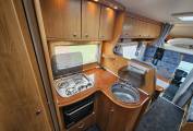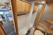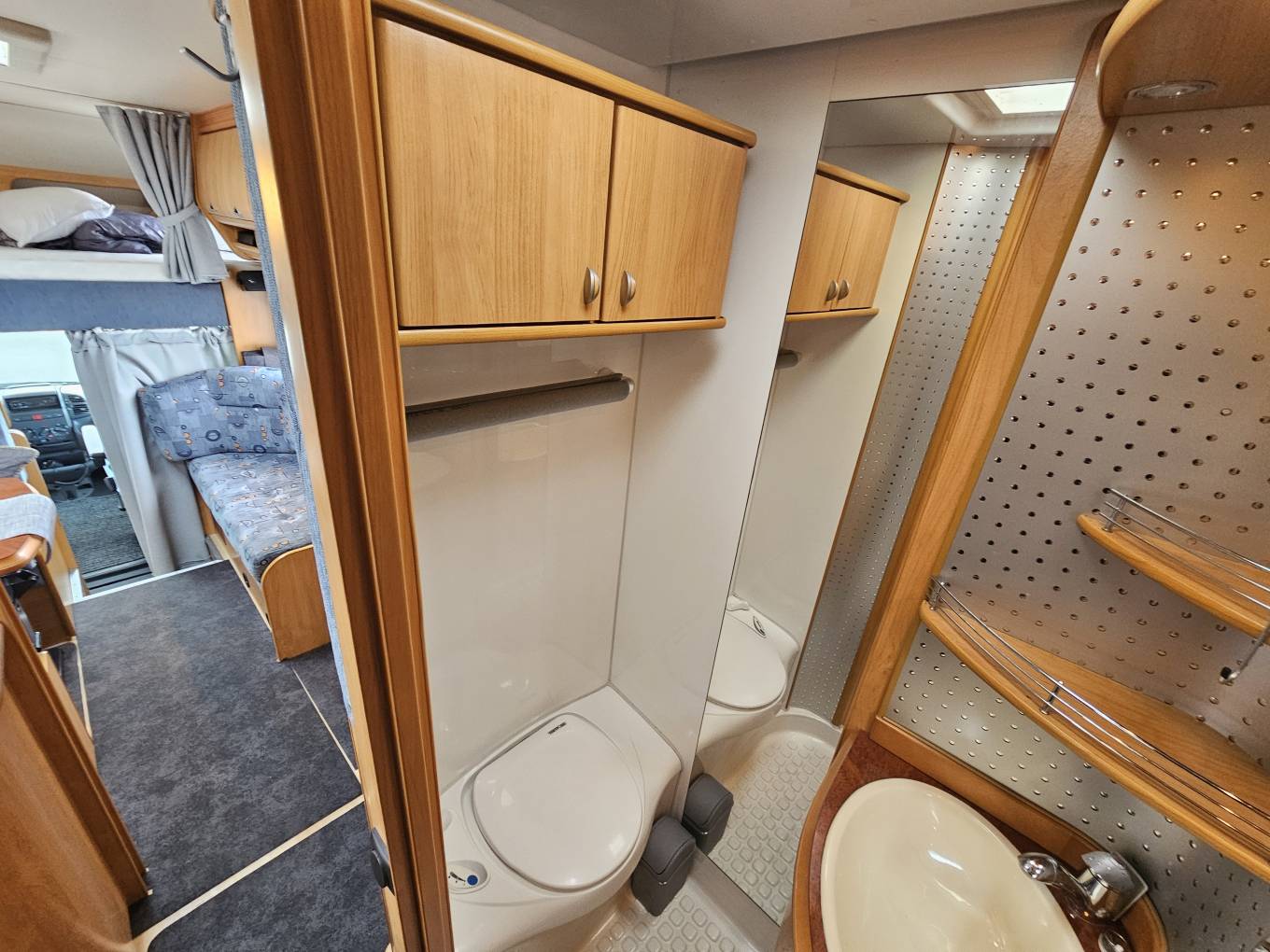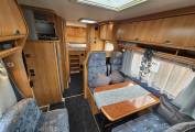 The interior has been refreshed with a new Thetford cooker, modern carpets, and stylish curtains, creating a homely, welcoming atmosphere. A key feature is the spacious bathroom, cleverly designed with an adjustable cabinet that transforms the space into a separate shower, offering added convenience and comfort on the go. The large rear garage provides ample storage for outdoor gear, making this motorhome a dream for adventurers.
