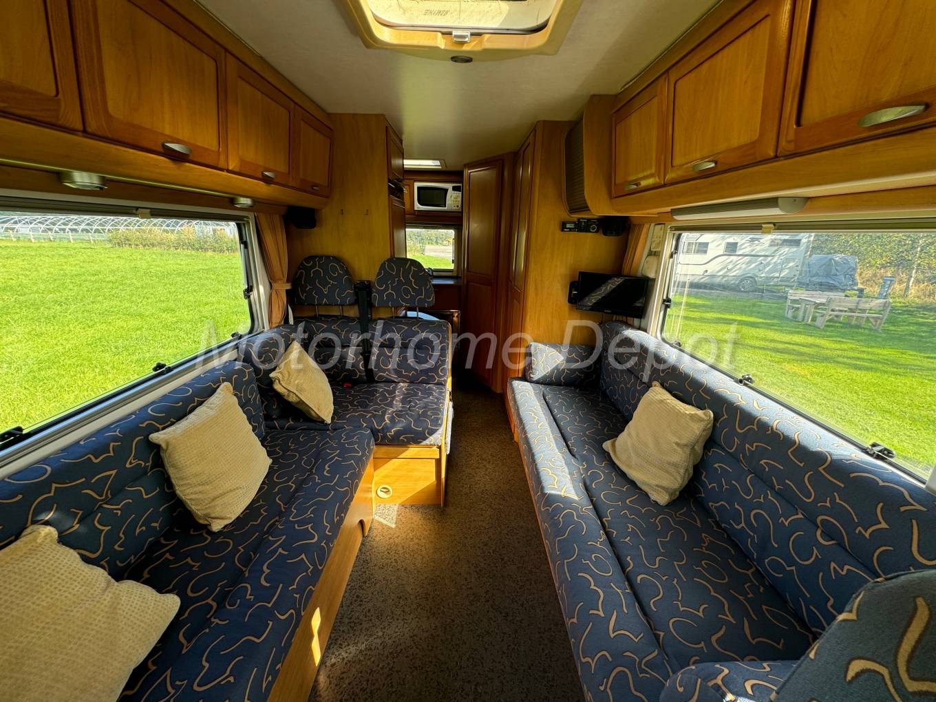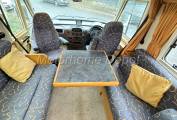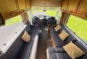 Moving forward is the lounge area which comprises of 2 large opposing sofas, the driver side is L shaped, the forward facing part includes 2 x 3 point lap & diagonal seat belts for travelling passengers. There is a pivoting table that can be rotated centrally in the area. The front two seats can also rotate to join the area. At night the L shaped sofa can be made up into a double bed & the near side a good sized single. There is a TV point at the head of the long sofa.
