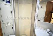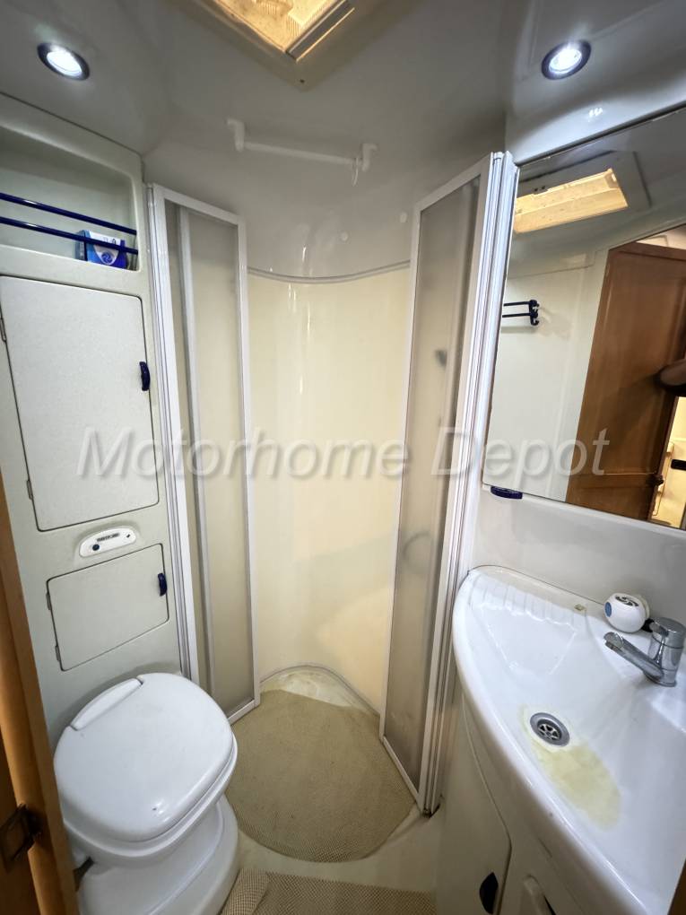 Next to the kitchen is the all in one washroom which comprises of vanity style white handwash basin with chrome mixer tap; separate shower enclosure with Perspex doors to close; Thetford cassette style electric fresh water flush toilet with swivel head.