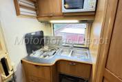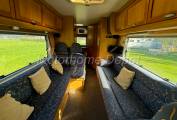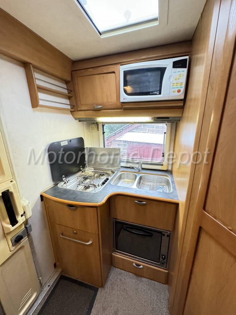 We enter the motorhome from the rear via a double electric step into the kitchen area which consists of: 3 burner stainless steel gas hob, stainless steel sink with chrome mixer tap; 12v extractor above and a Microwave oven for use on site. Below the counter is a good sized Smev oven and grill. There is plenty of cupboard and drawer space for all your holiday provisions & utensils. On the opposite side is an island with bin drawer & 3 way fridge with freezer box that can be powered by 12v, 240v or gas depending whether you are plugged in on site or wild camping.