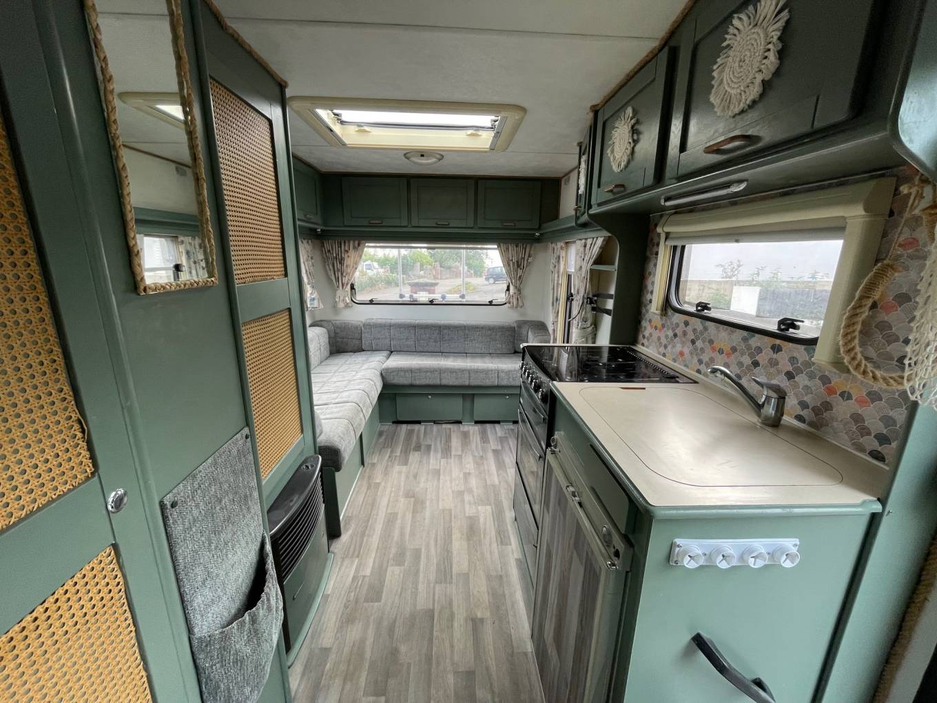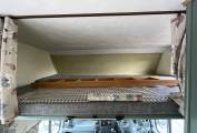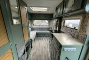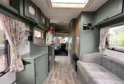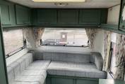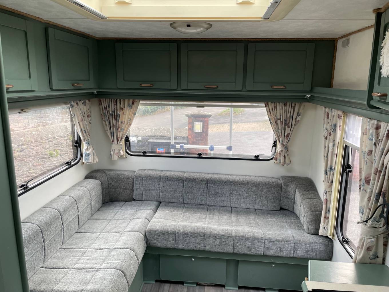 At the rear is the spacious U shaped seating area which converts into a large double bed. For dining and entertaining there is a large table which can be stored in a cupboard by the Washroom. There is also ample storage space.