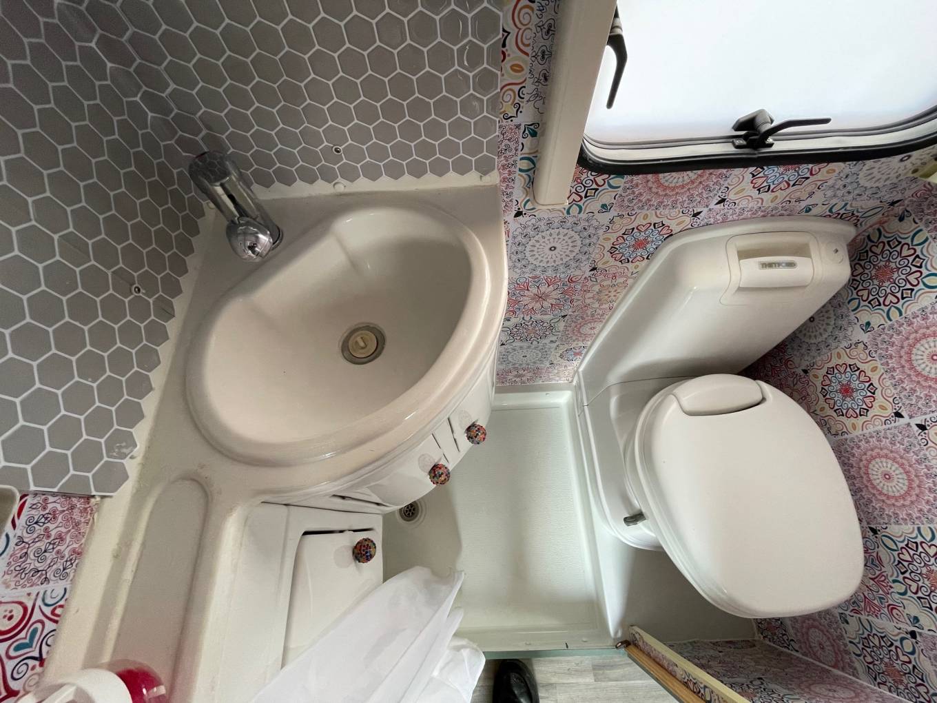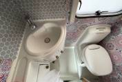 The washing facilities contain a compact shower, cassette toilet, hand basin, storage cabinet and mirror.