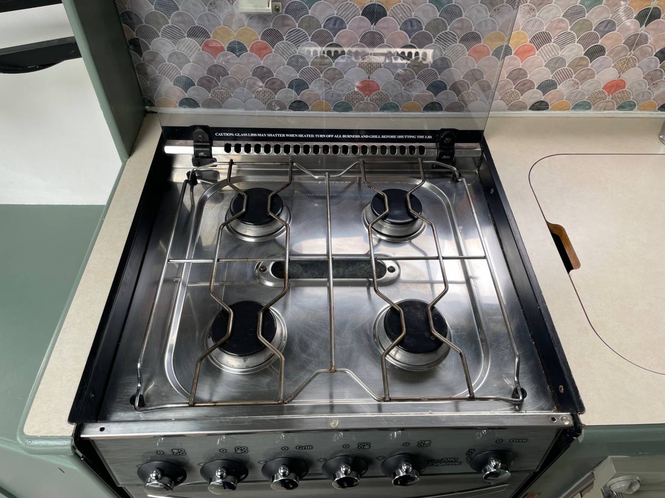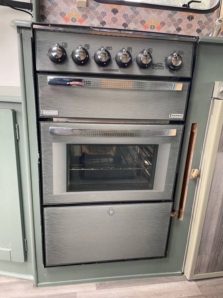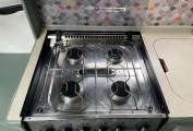 The kitchen, opposite the shower room, has a large fridge with freezer compartment, 4 burner gas hob, oven, grill, sink and good cupboard storage.