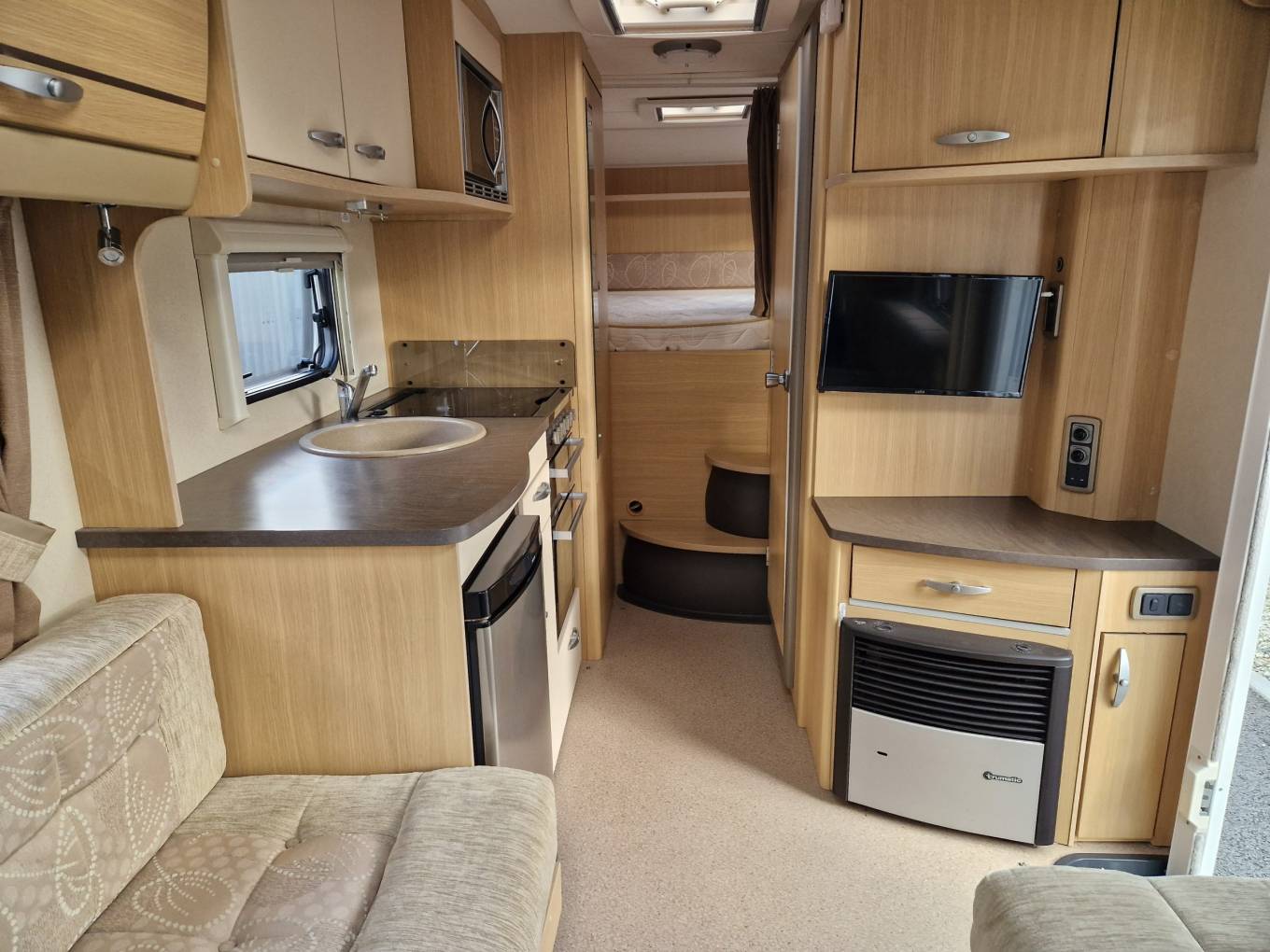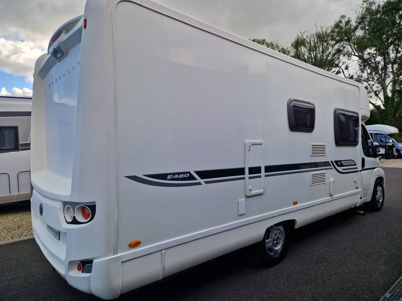 2011 Bessacarr E480 4 berth motorhome for sale. Presented in great condition with an abundance of living space and also storage space thanks to the large rear garage area with bike rack. The front lounge area with twin opposing sofas and swivel chairs offers great comfort and can be transformed into an additional 2 berths. The mid ship supports a well equipped kitchen with microwave and a washroom with toilet, basin and shower. Other features include Fiat Ducato 4005 kg chassis (C1 license required) reverse camera, solar panel, on board heating and hot water, TV and aerial, awning, cab shades, cab air con, cruise control and much more. Sale will include full mechanical service, gas certificate and 6 months warranty. Please call for further details…