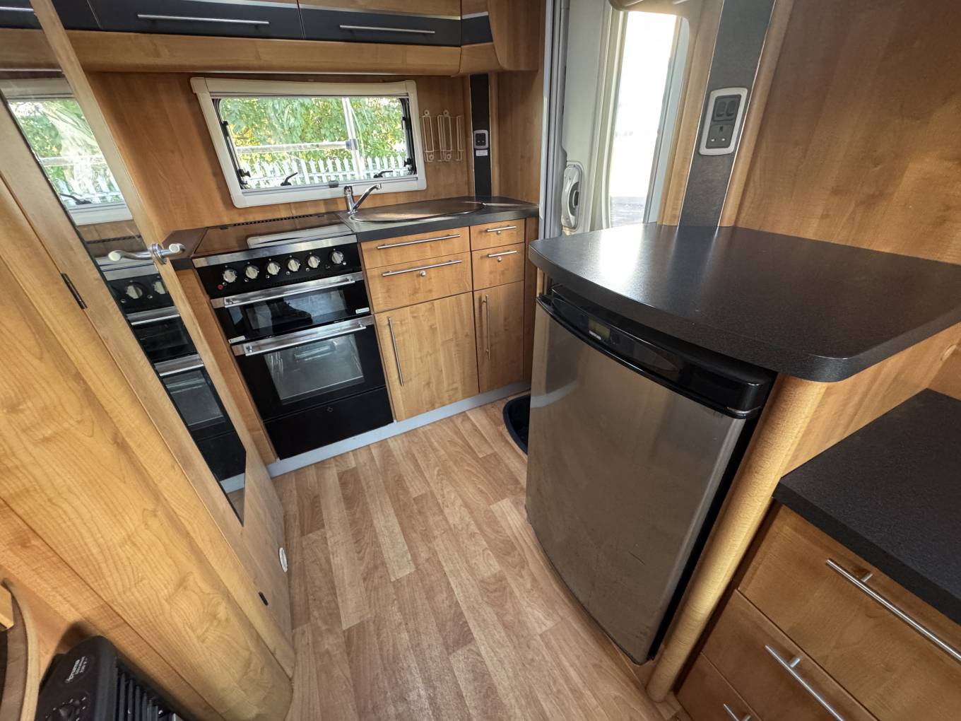 End Kitchen with Full cooker, oven, Grill and dual fuel hob, stainless steel, microwave oven and sink with draining area, 3 way Fridge with freezer, Locking soft close drawers, under counter lighting.
