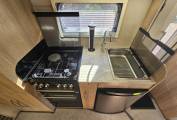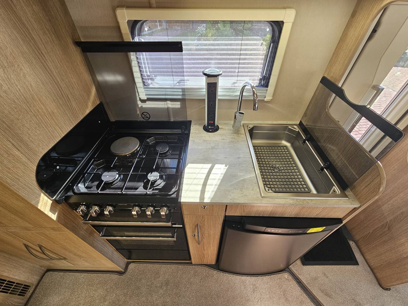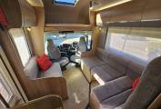 The motorhome’s spacious 6 berth layout offers versatile sleeping options, including a large over cab bed, a luxurious rear fixed double bed, and a convertible centre dinette. With 4 seatbelts, it's ideal for comfortable and safe travel for the entire family. Inside, the beautifully designed living area includes a fully equipped kitchen with a 3-burner gas hob and 1 x electric hob, oven, microwave, and a fridge with freezer compartment.