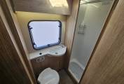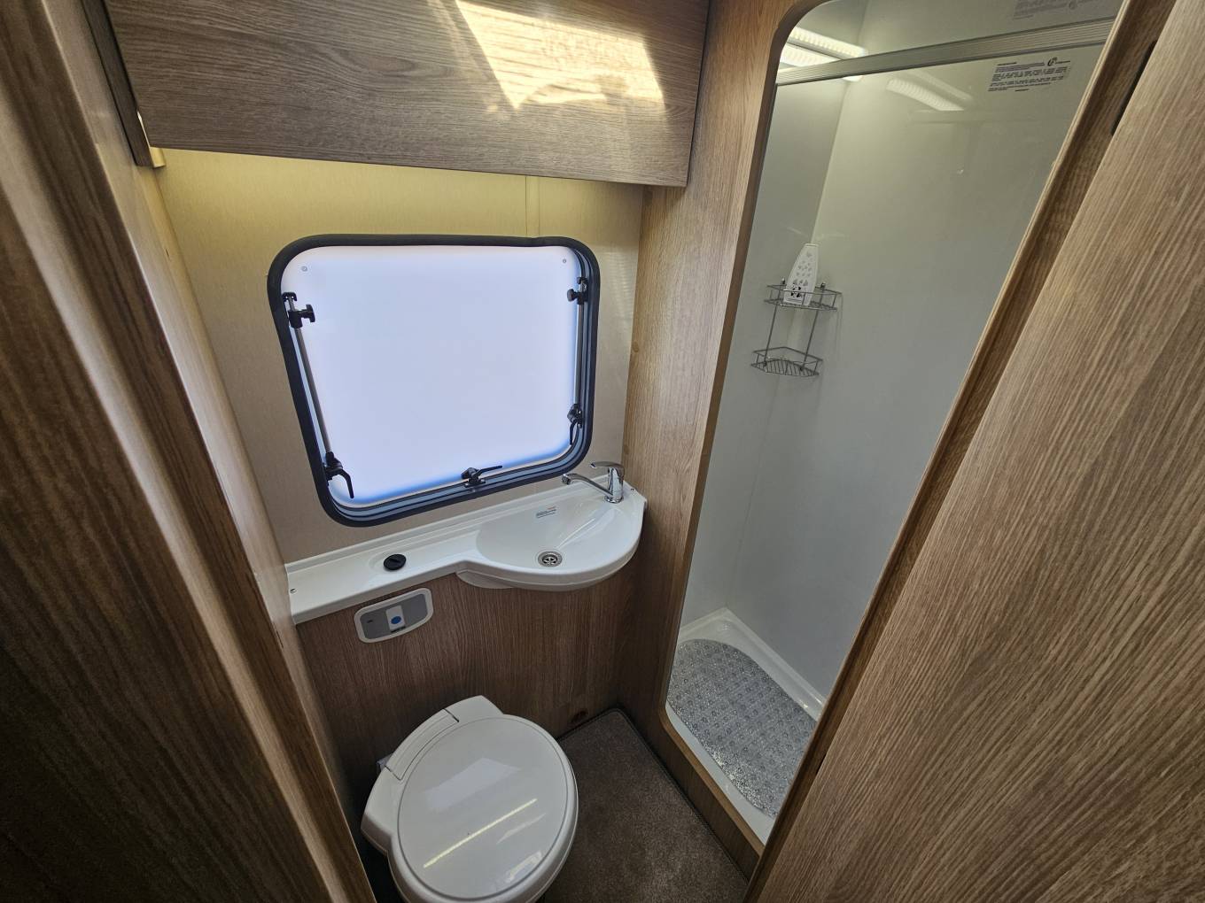 The modern washroom features a separate shower cubicle, cassette toilet, and stylish sink area. Plus, with the large rear garage, there’s ample space to store bicycles, outdoor gear, or extra luggage, ensuring you have room for everything.