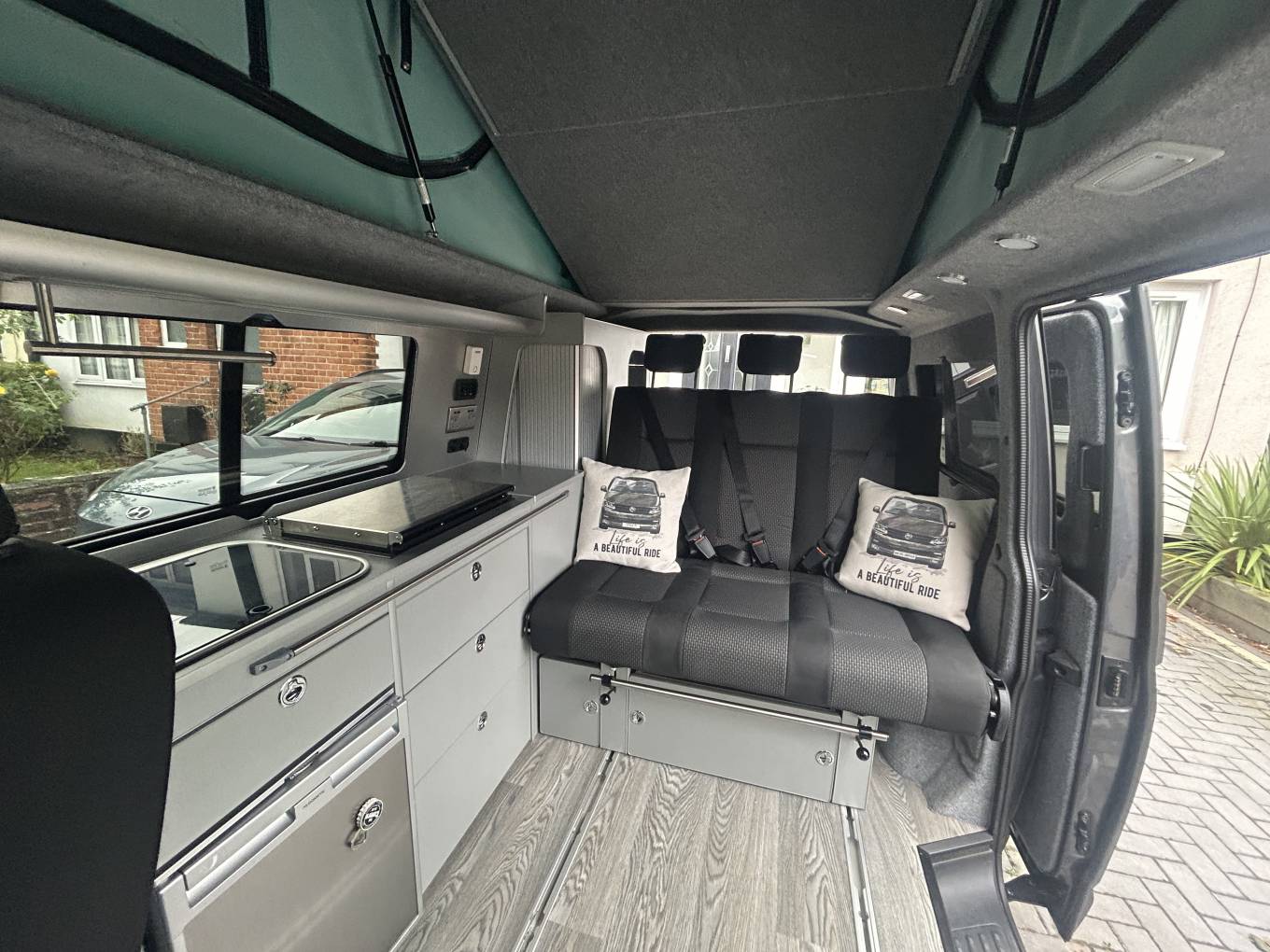 The internal conversion was completed by Wam Bam Campers - and was done to a very hight standard and using the best available accessories. Having seen many campers you can tell the ones that have tried to save money - and the quality conversions - and this is definitely at the high end. Important details include - Reimo 3000 Rib bed with sliding seat system. This gives you a far more comfortable bed, more storage and the whole unit can be moved forwards to give you lots more boot space if you need it. Both front seats rotate around and has a small removable table. This van comes with cold water sink, Fridge, Wallas duo diesel hob and heater. The Poptop roof is also excellent - in keeping with the rest of the van - with zipped panels giving you loads of light and most importantly fresh cool air when used in summer. The camper also has black out blinds giving you privacy at night. The motorhome has electric hook up but also has the solar panel to keep everything topped up whilst off grid.