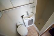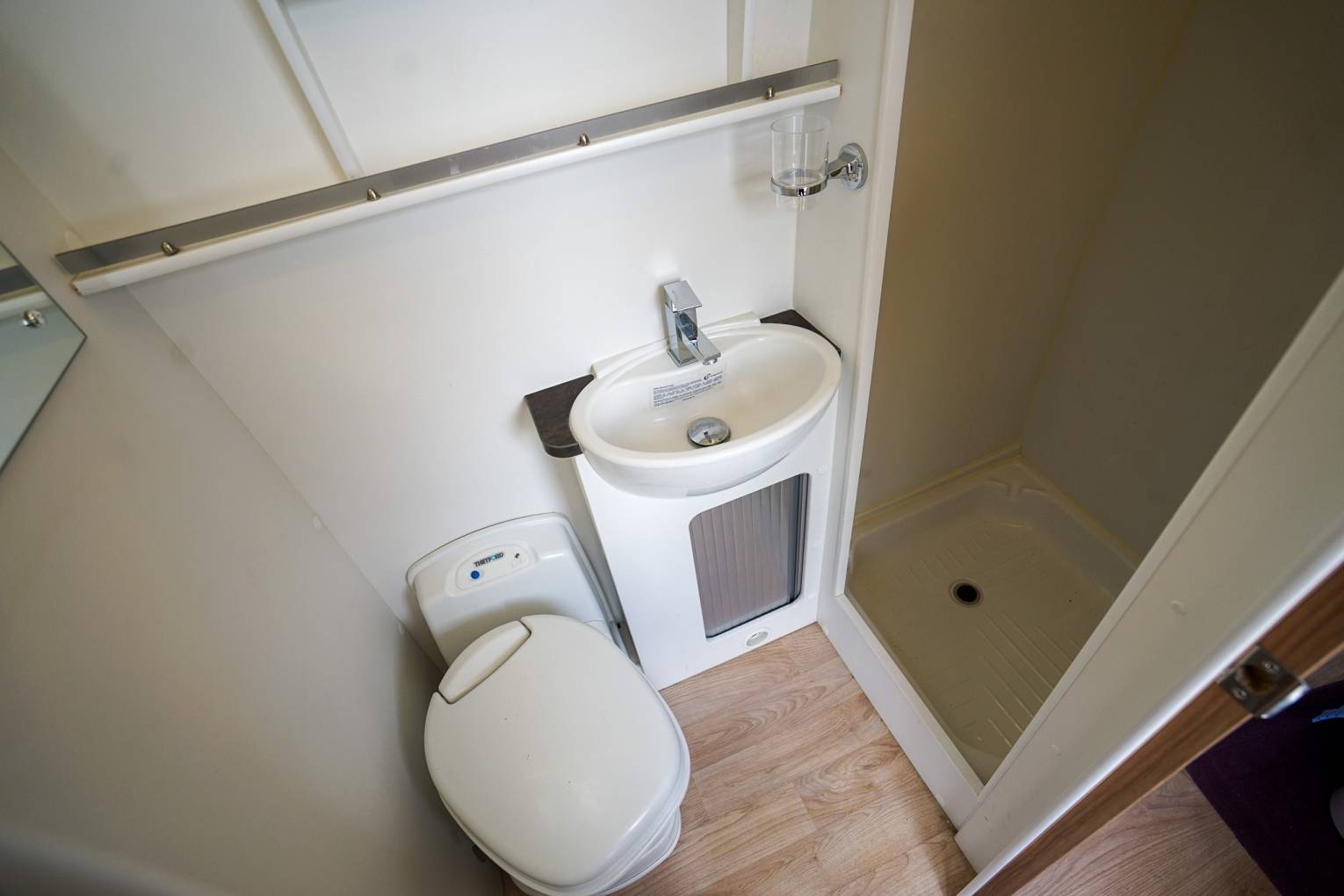Next to the fridge is a large washroom with separate shower cubicle to one side, an electric flush toilet and wash basin.