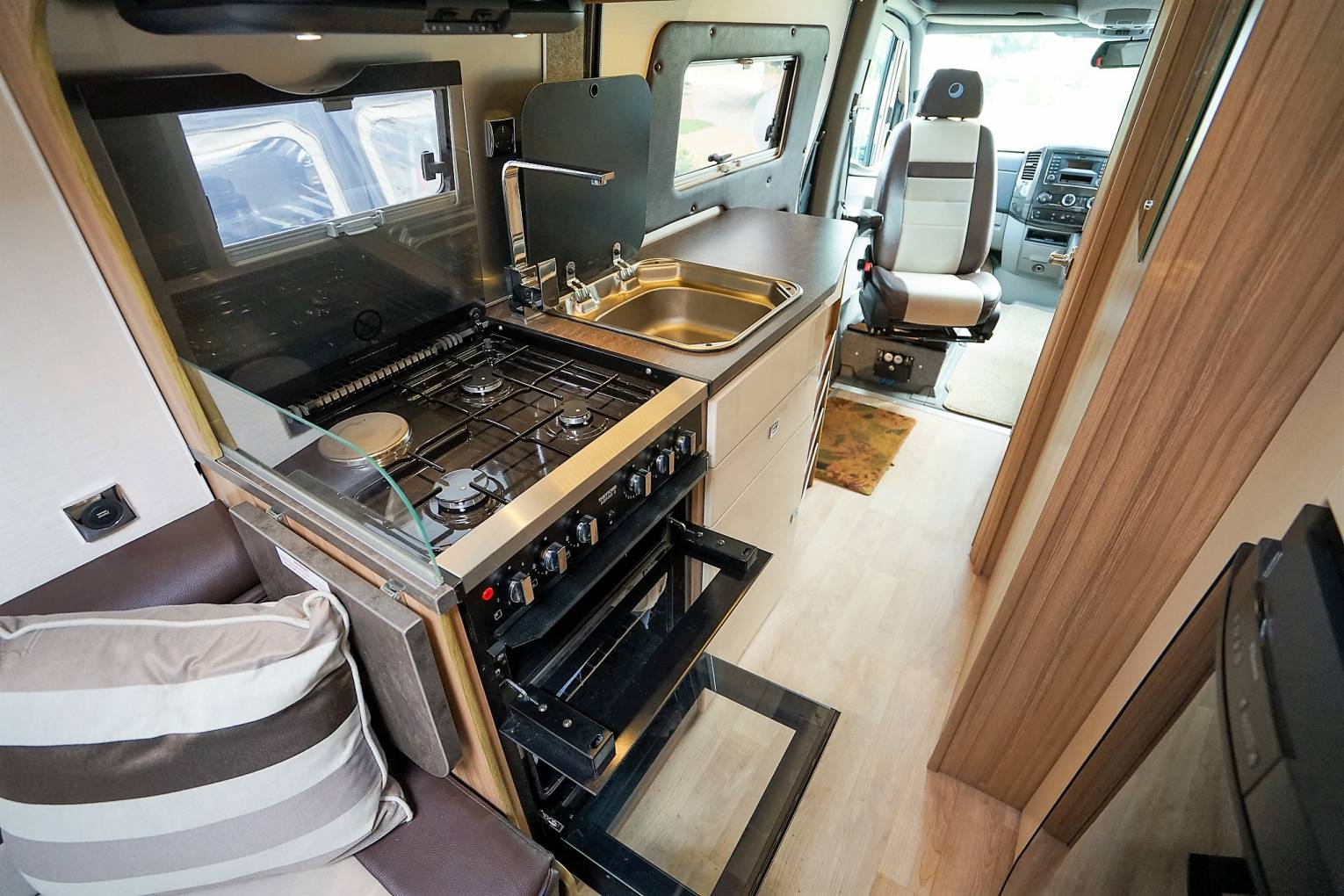 Stepping inside the van, you will find it has been finished to a high standard. The cupboards are finished in high gloss, the worktops have extensions to allow for more space in the kitchen and the Sofa’s are finished in a neutral cream and brown hardwearing material. The owner has had extra Upholstery trim professionally fitted around the rear windows and to the sides of the Sofa for that luxurious feel.
