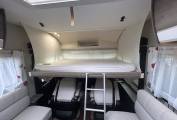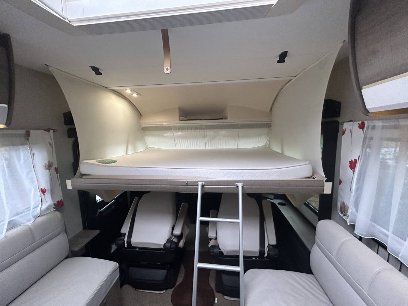 Sleeping arrangements are sorted with a large double pull-down bed over the cab, complete with an access ladder. The spacious dining area features two forward-facing seats with extra seat belts, ample storage in wall units and beneath the seats, and a 12v TV with a sound bar mounted on a wall bracket for your entertainment.