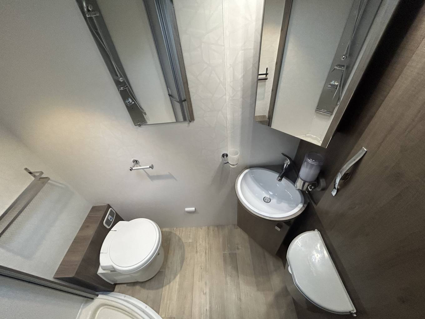 The washroom includes a large shower cubicle, cassette toilet, vanity unit, large mirror, and built-in bin, making it feel just like home.