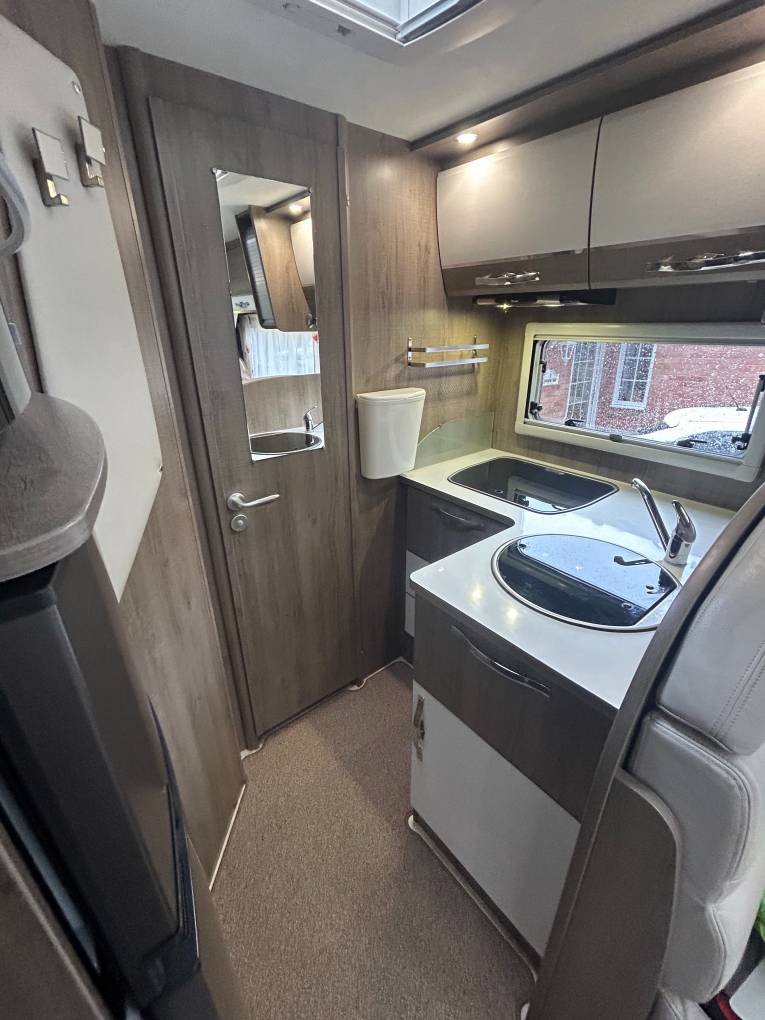 The kitchen is fully equipped with everything you need on the road, including a gas hob, sink with a mixer tap, an extractor fan, an oven and grill, and a 3-way fridge freezer. Storage is plentiful, ensuring you can bring all your essentials with ease.