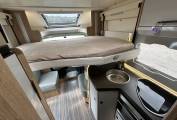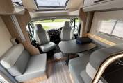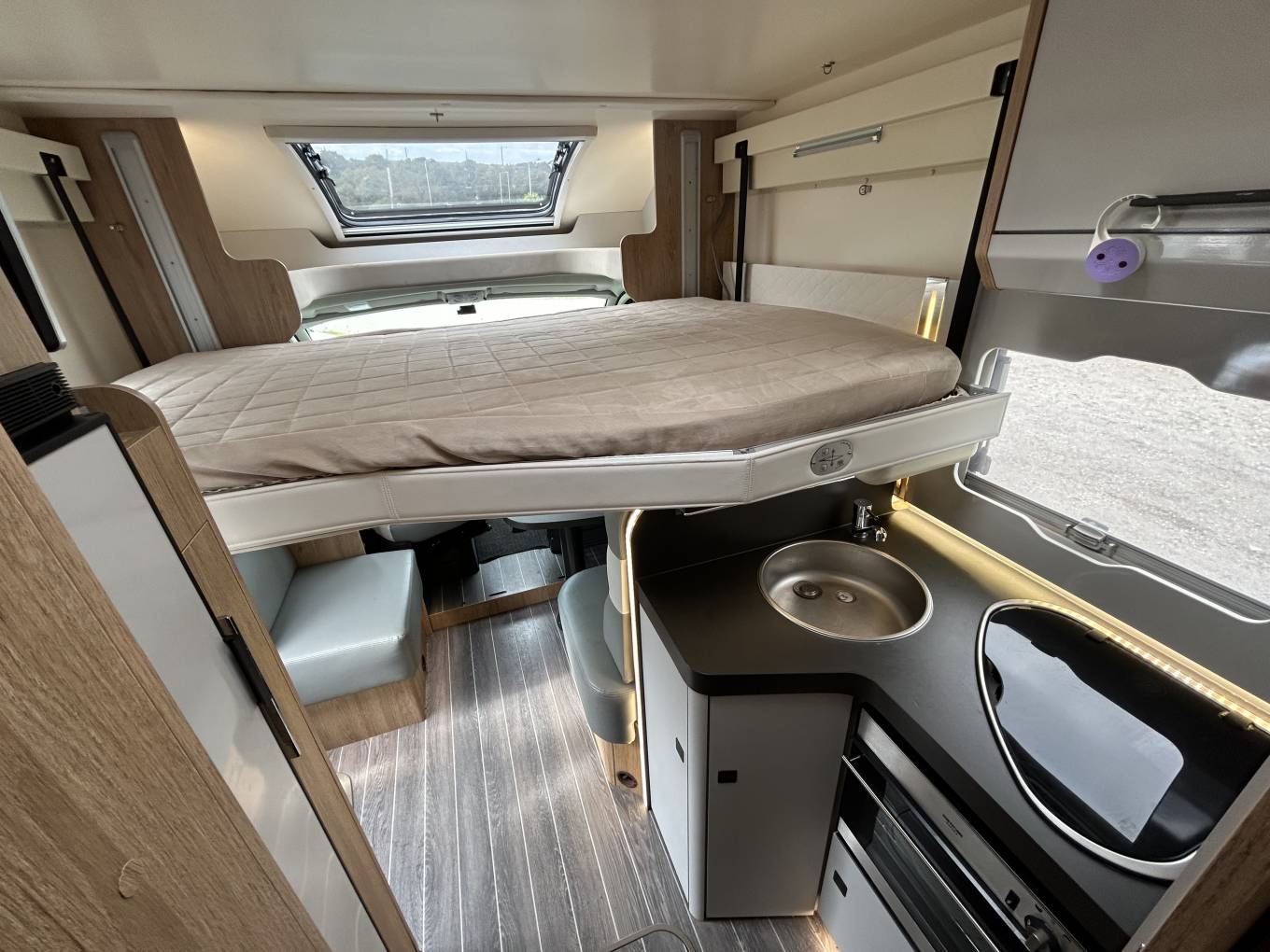 The lounge area behind the cab seats is a lovely feature and you will find the upholstery is in great condition. You have a table to help relax and enjoy each others company and you could easily sit 5 people around this area when you take advantage of the 2 front swivel seats and small side facing bench. The final sleeping area is found in the large electronic drop down bed above the lounge area and is operated with ease.