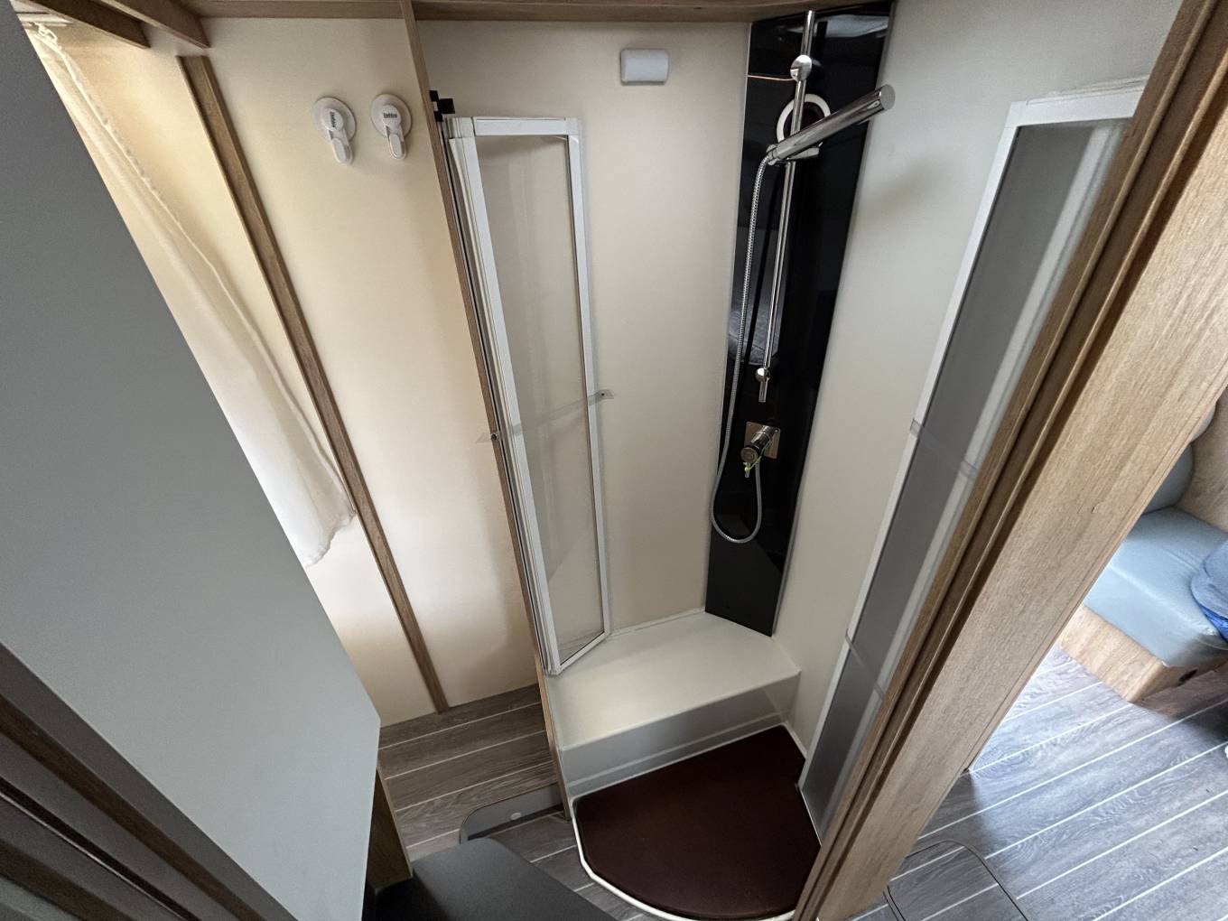 Layout - The end bedroom boasts a luxury Island bed with storage and wardrobe space, the desired separate shower cubicle can be found at the bottom of the bed and the separate toilet on the other side. The bedroom can be shut off from the rest of the motorhome and the bathroom if you desire. The kitchen area which is across from the habitation door to allow extra ventilation comes with 3 Gas Hobs, Hot and Cold Mixer Tap, Oven/Grill Combi, and a Large Modern Fridge with Freezer space.
