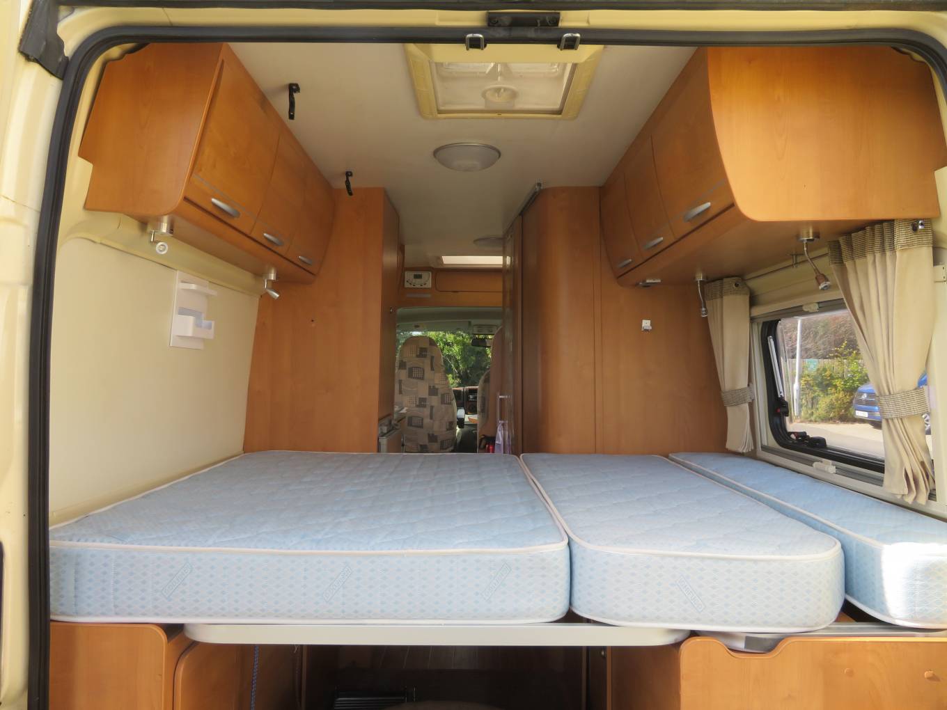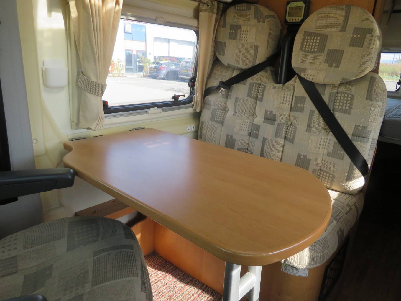 The 665 model has the fold up double bed at the rear, it is a 3 berth with 4 travel belts and has a bathroom with shower and kitchen area in the centre. At the front the driver and passenger seats swivel to provide additional seating to the dining and lounge area. The van has been well maintained with documentation showing good service history including a cam belt change in 2019. It comes with cab air con, immobiliser, cruise control, blown air diesel heating, awning, TV aerial and electric step. It also comes with tow bar, bike rack, 100w solar panel, 2 sets of keys, gas bottle, mains lead and is completely ready to enjoy.