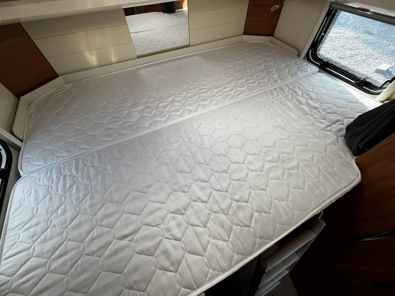 Sleeping – Transverse Rear fixed bed above garage, LED lighting and flyscreens/blinds.