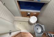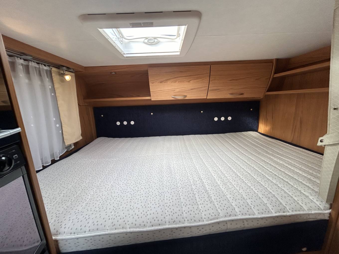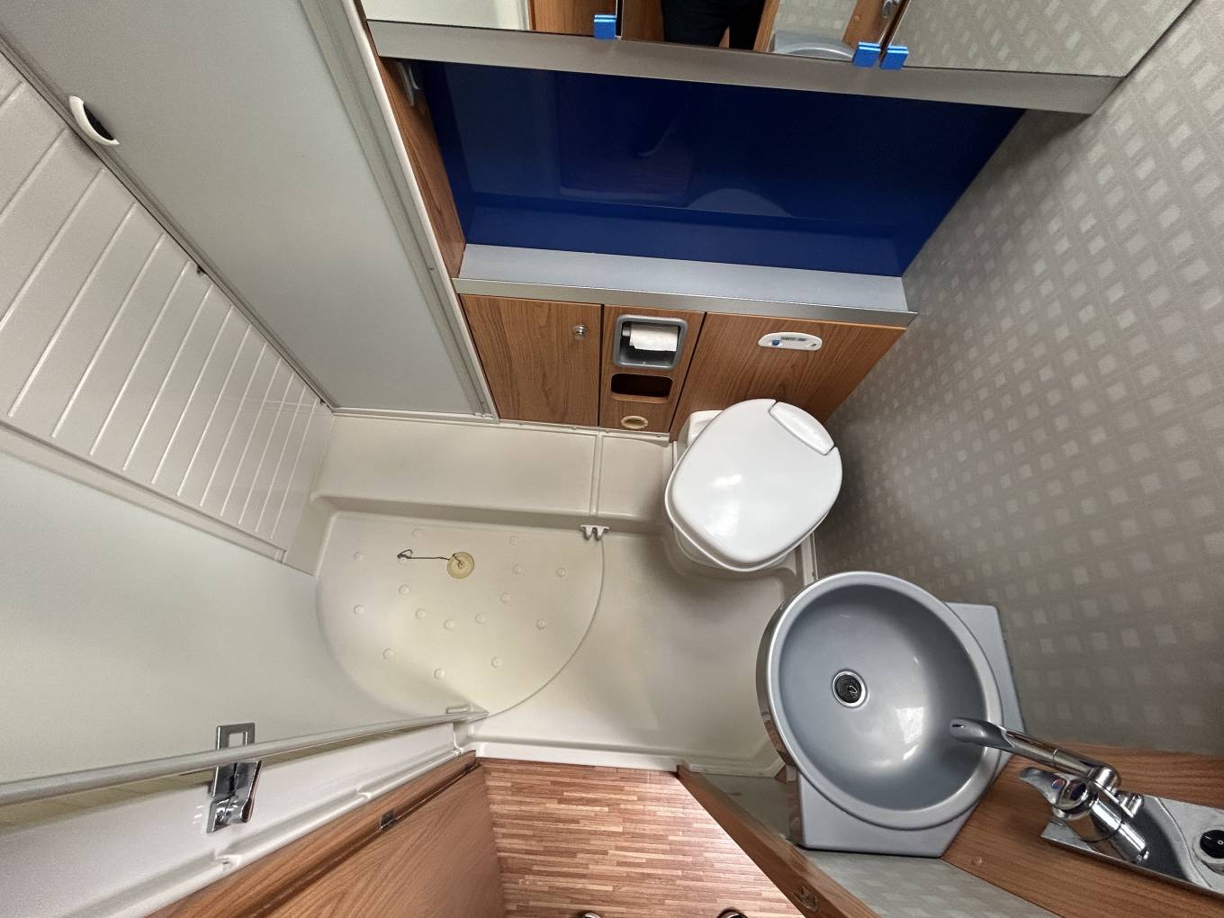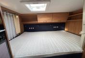 Retreat to the bedroom, where a large double bed awaits, complete with ample overhead storage in the wall units. The bathroom offers the full comfort of home with a separate shower cubicle, cassette toilet, vanity unit and sink, making it easy to freshen up after a day of adventure.