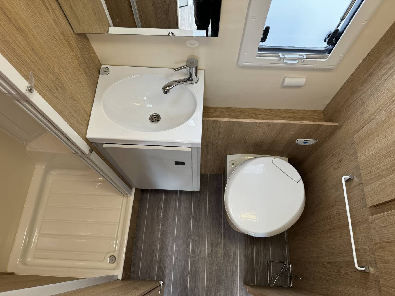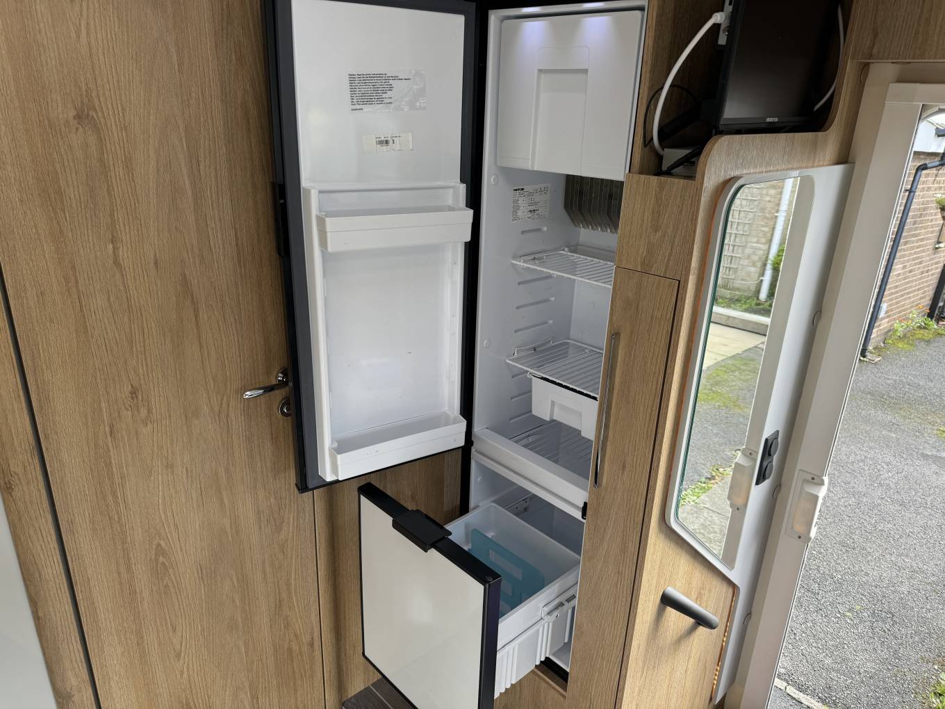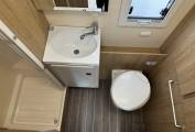 At the rear, you’ll find a spacious washroom that features a full-length separate shower, a stylish wash basin with a mixer tap, and a separate Thetford toilet – complete with handy storage for all your essentials.