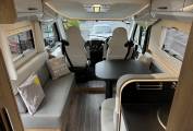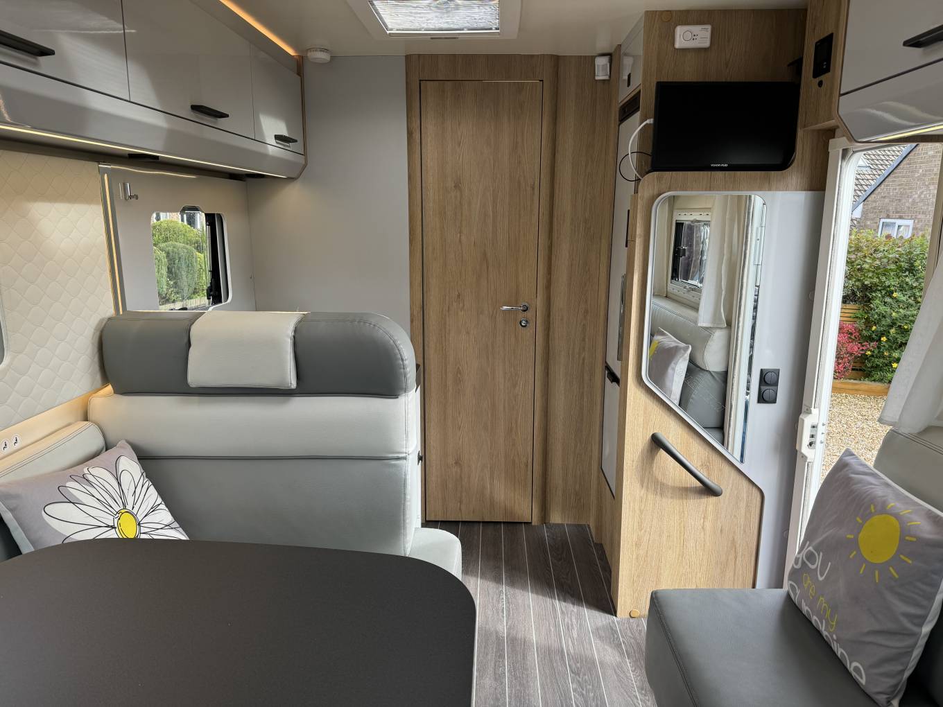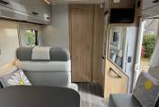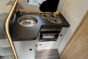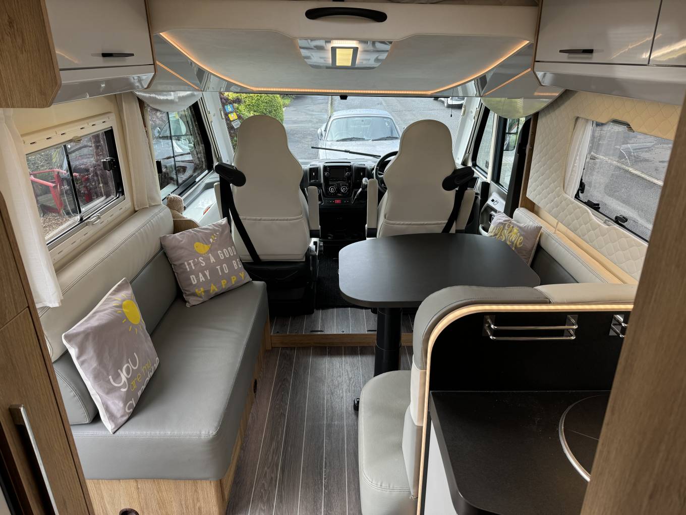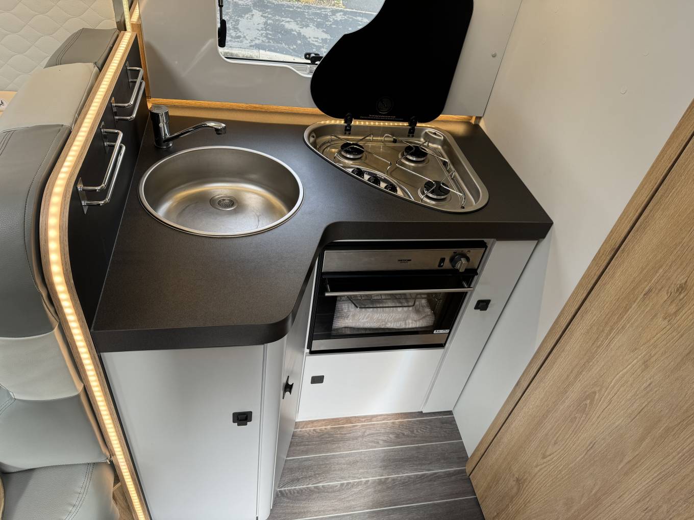 As we move to the front, check out the stunning LED lighting that brings the space to life! The lounge/dining area is super inviting, featuring rear travelling seats and a cozy side-facing sofa that transforms into a double bed. Plus, the swivel driver and passenger seats face a versatile dining table, creating that perfect family atmosphere. And don’t forget the spacious drop-down bed above – it comfortably accommodates two adults!