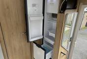 Moving through to the centre of the motorhome, we come to the kitchen area where there is a Thetford Duplex oven and 3 ring gas hob supplied from the gas bottles located in the exterior storage unit. Next to the cooker is the sink with mixer tap and opposite is the full length Therford 3 way fridge with freezer compartment and chiller drawer.