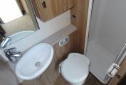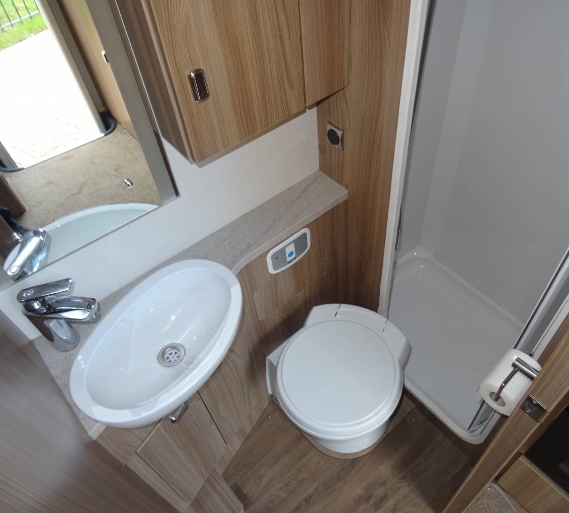 In the opposite corner the bathroom has a Thetford flush toilet, wash hand
