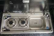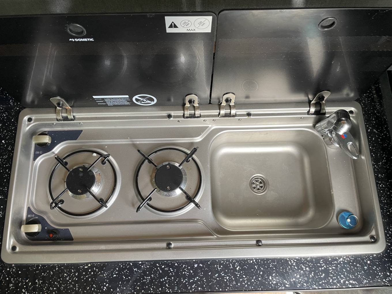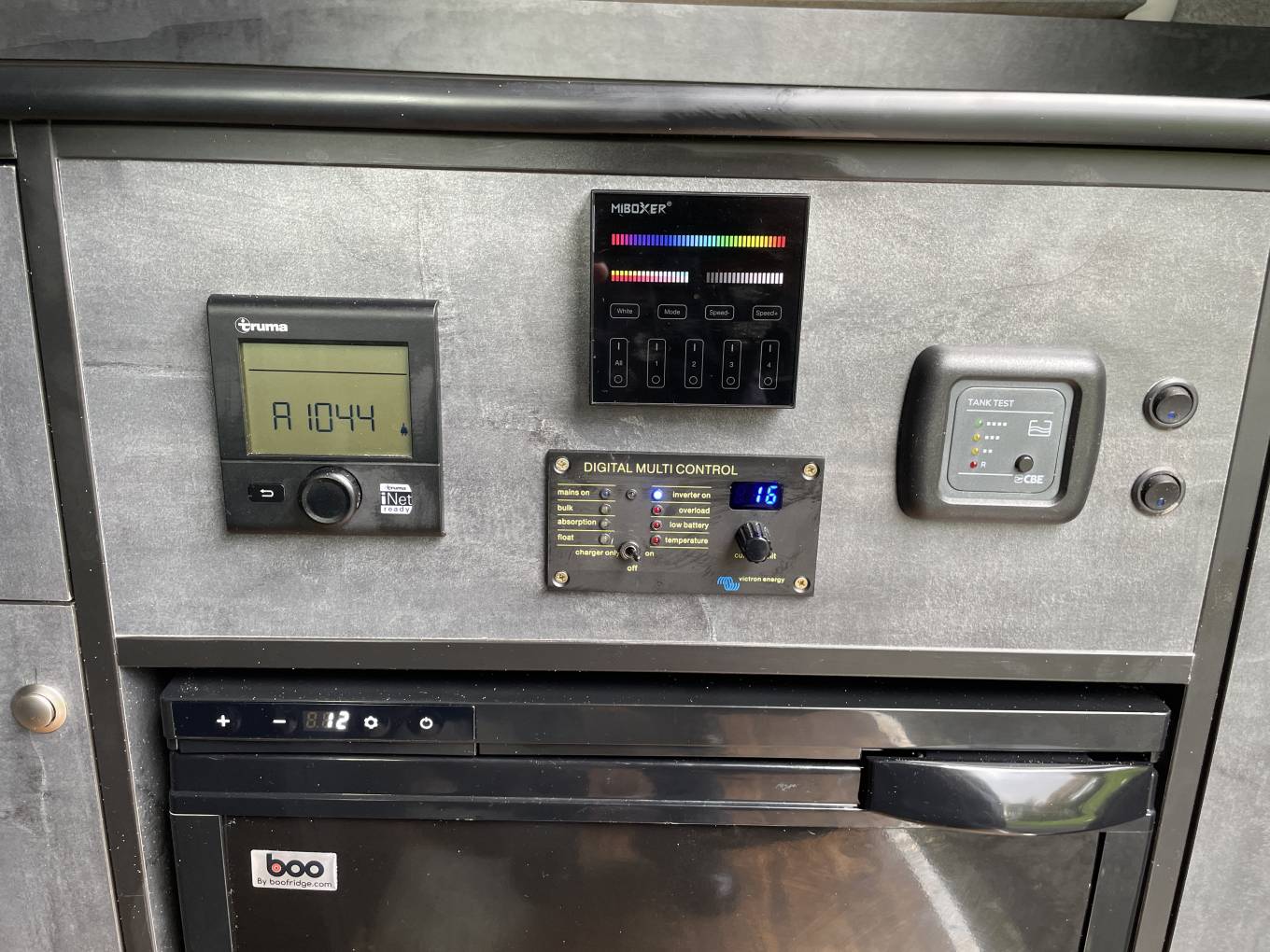 Along with the rear fixed bed not only does the center travelling seats convert into a bed and there is a front bed board and mattress to allow for another very generous bed in the cab area. This is a fully equipped camper that comes with gas, water and plenty of solar power along with an inverter to allow use of the sockets even when you are not plugged in on site. With a Truma iNet heating system, fridge/freezer, microwave, gas hob and a drop down television this is a truly ready to get away campervan. It even has its own adjustable lighting system for mood lighting or a complete disco effect.