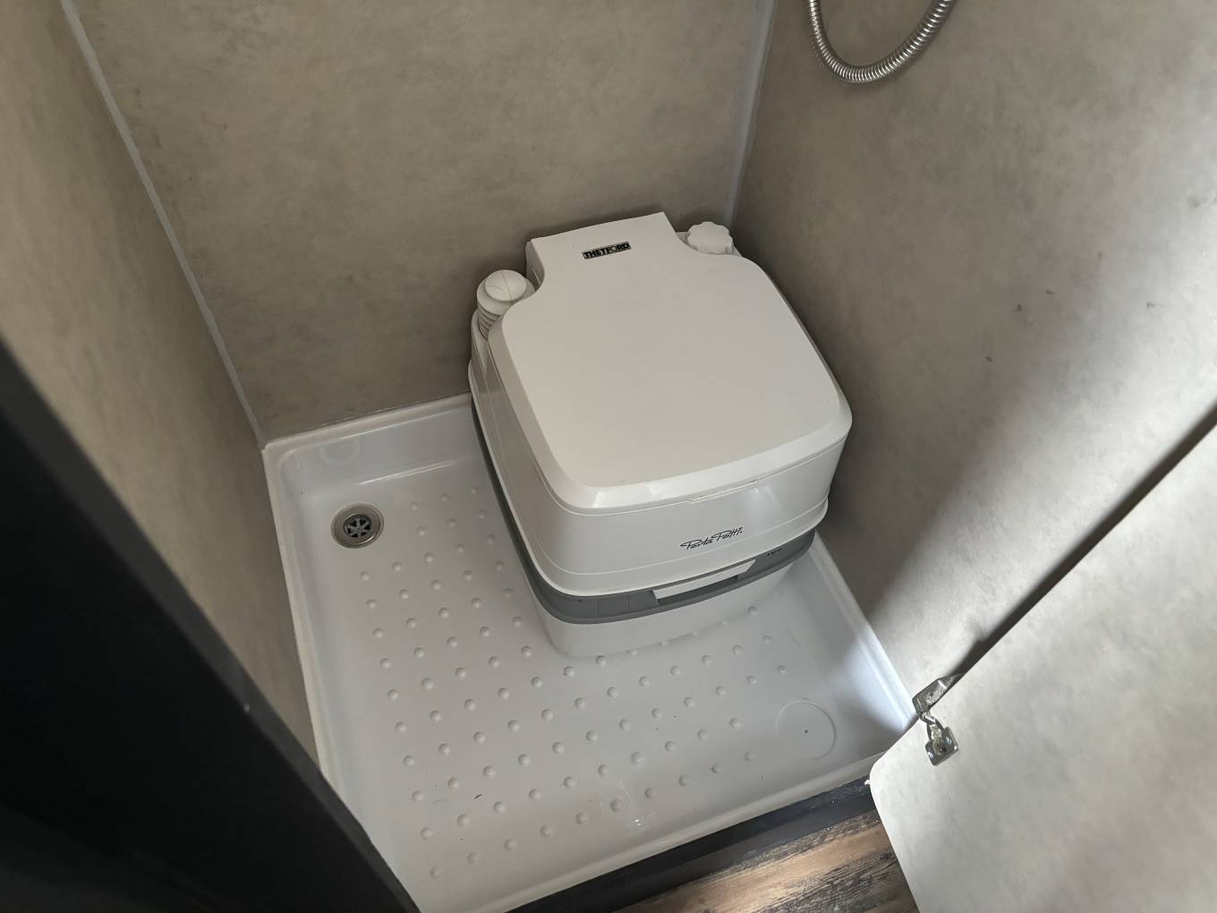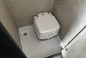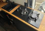 The layout in the habitation area is a fixed transverse double bed at the rear with a smaller single bed underneath. In front of this is the washroom which contains a shower and a Porta Potti and opposite this is the kitchen area which has a sink with hot and cold running water and 2 gas hobs for cooking. There is plenty of storage space dotted around including a large rear garage under the bed, over cab storage compartment and a built in wardrobe.