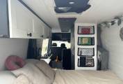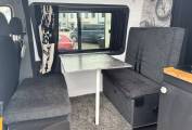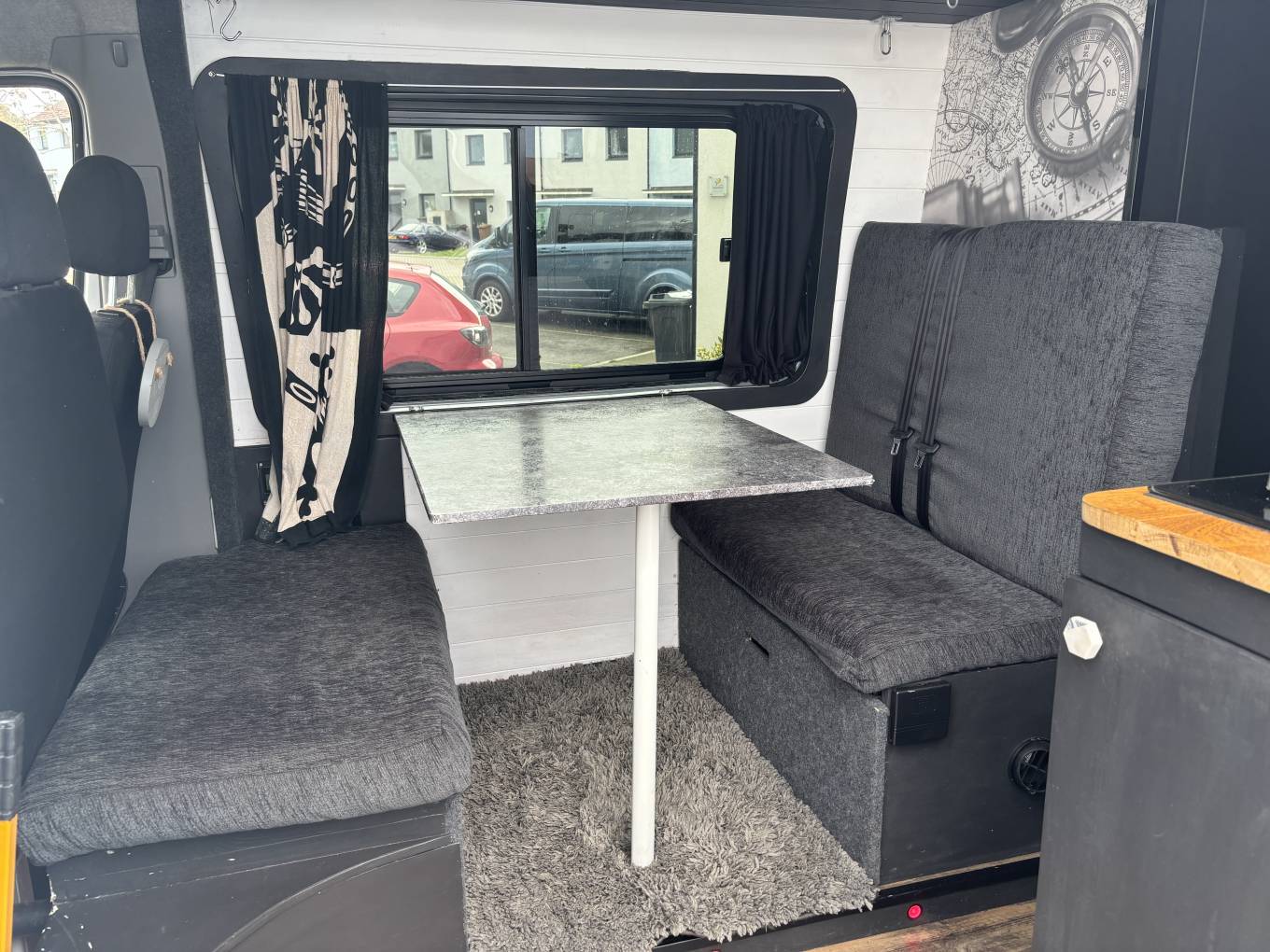 As we move to the front of the van there is a dinette with 4 seats which converts into another bed and the double passenger seats swivel to create lots of sitting space for eating and relaxing. The cab has air con and a stereo with radio and phone connectivity and extras include TV, 2 solar panels and a 2000W power inverter so you will never be short of places to plug in all your appliances.