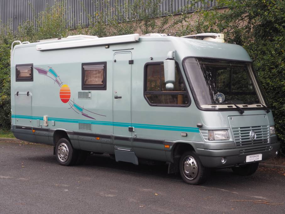 Very rare LEFT HAND DRIVE automatic RMB 670 Silver Star Liner Class motorhome on twin rear wheel drive Mercedes 410D chassis, having outstanding build quality and featuring a forward dinette, centre kitchen, washroom, separate shower, rear garage. Built to an incredibly high standard and with just two owners from new, this luxury motorhome offers a wealth of specification and upgrades including onboard 60 litre LPG domestic gas tank, habitation air conditioning, 200 litre fresh water tank, 200 litre grey waste tank, 320W combined solar panels output, 3000W inverter, Propex ducted air gas heating, Oyster satellite system with TV and soundbar, 2 fitted safes.