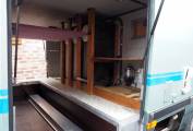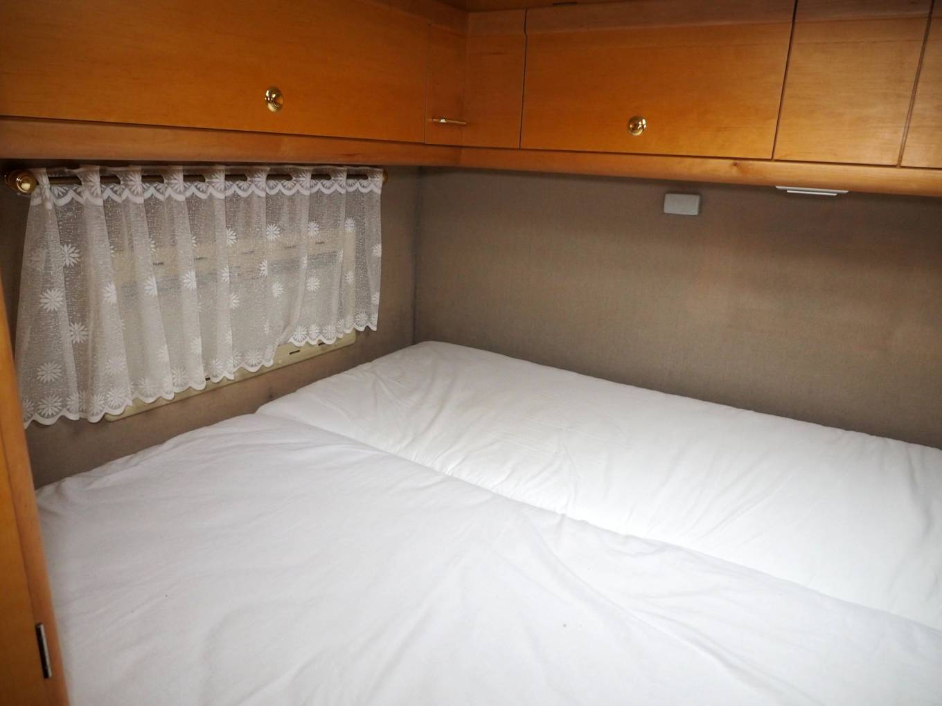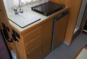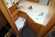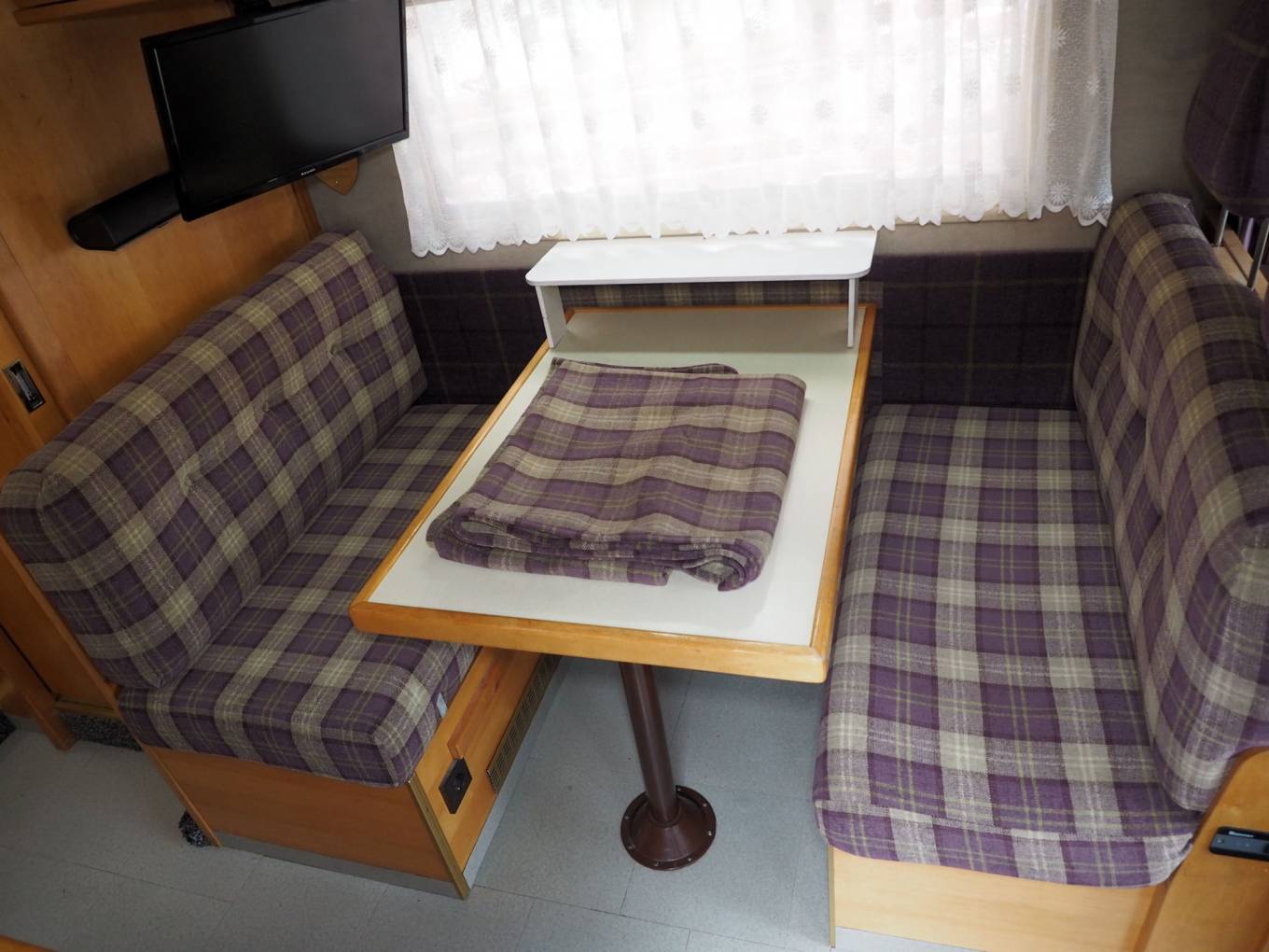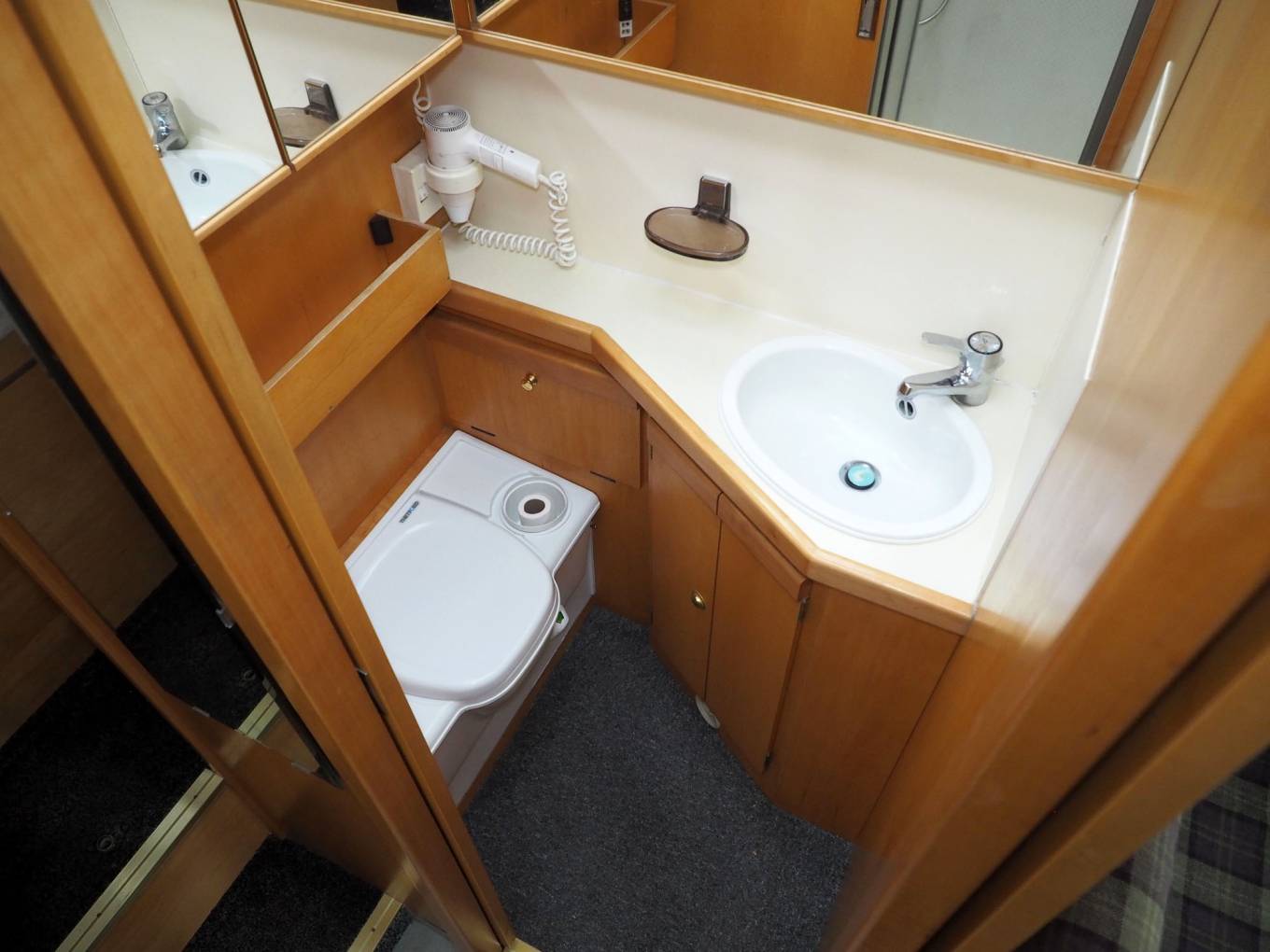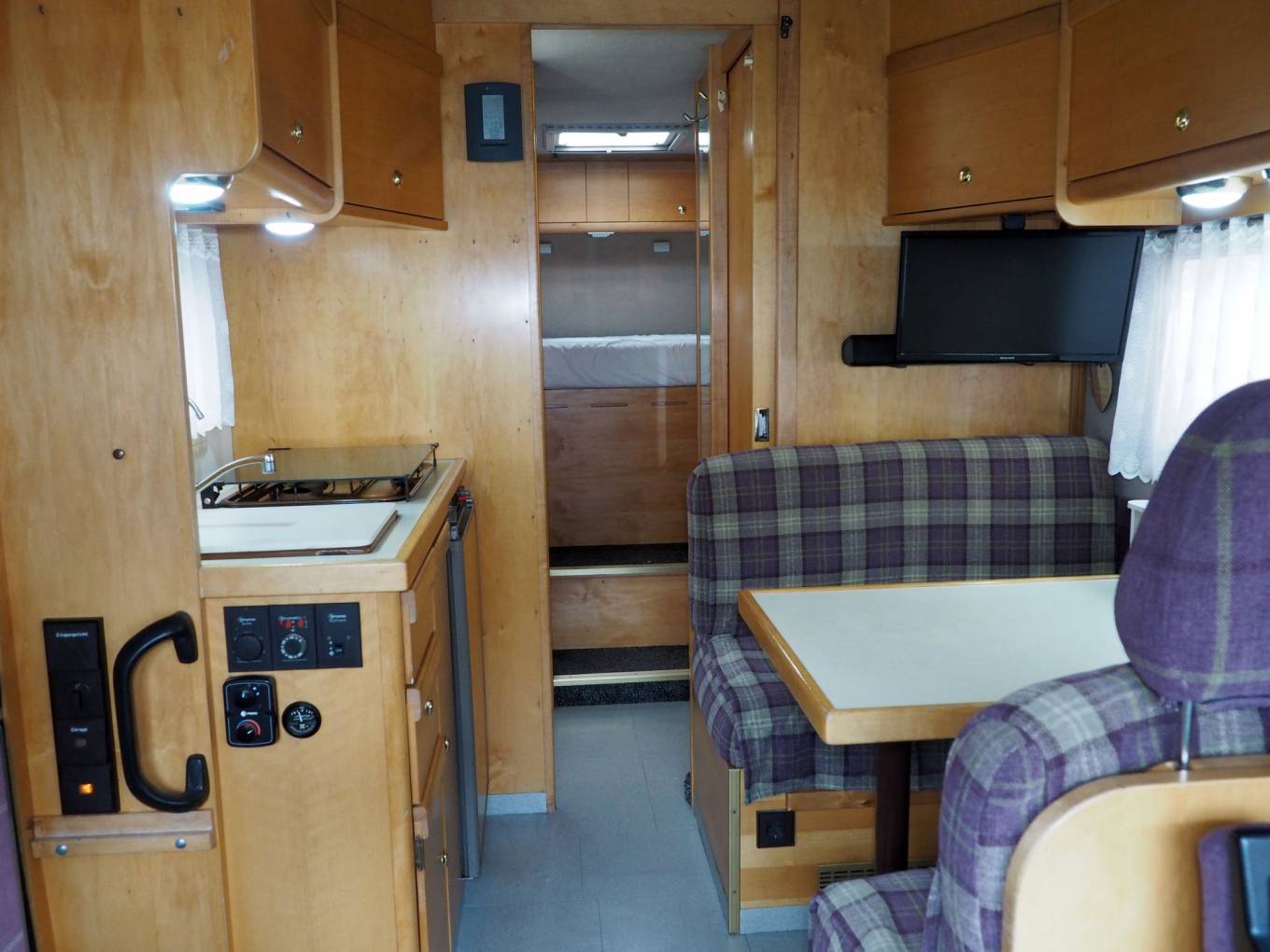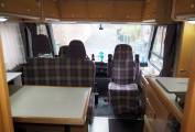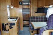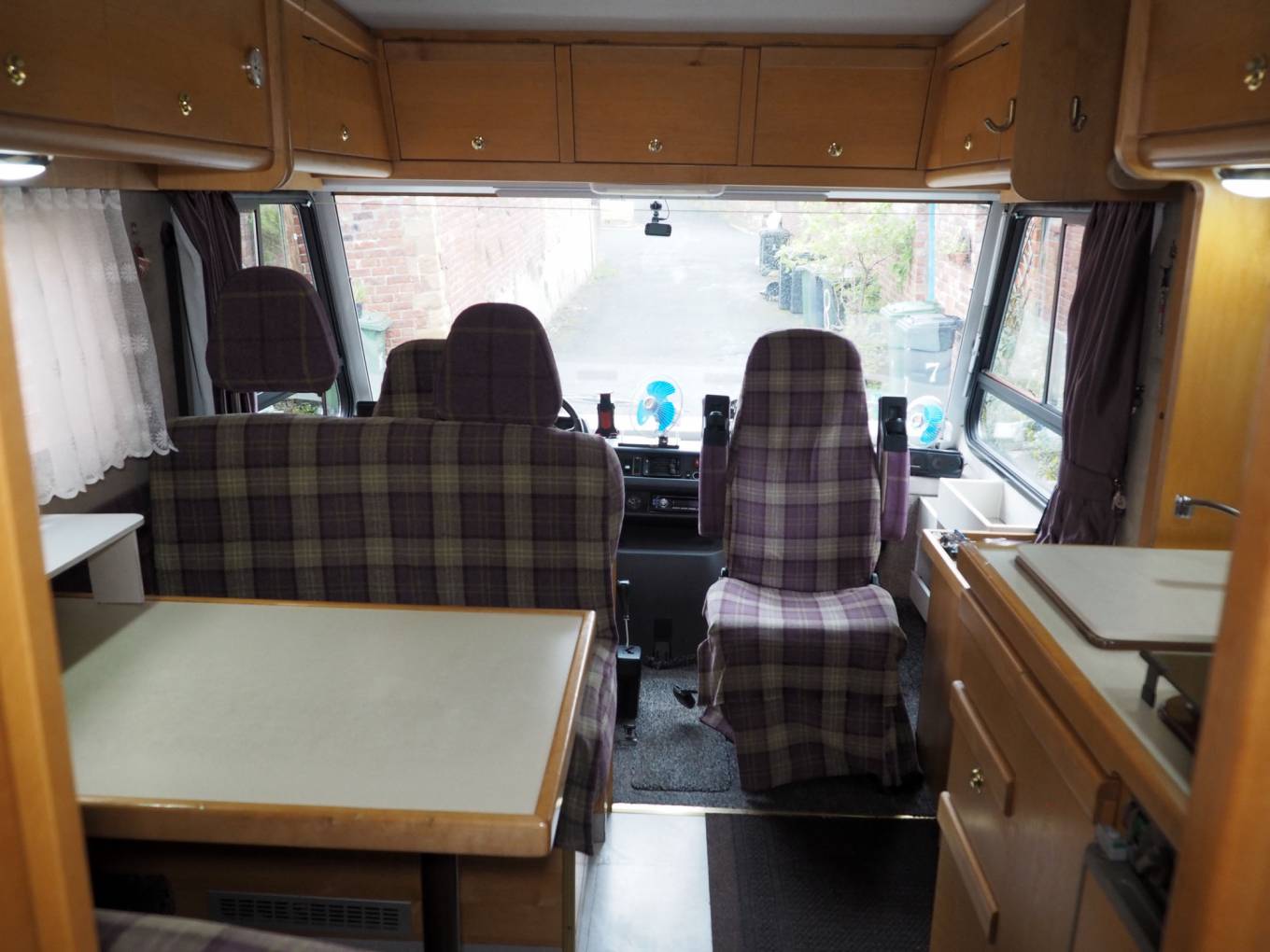 Essentially the layout comprises of swivel cab seats, a pullman style dinette with table, kitchen with gas hob and three way fridge, washroom with toilet and vanity sink, separate shower cubicle, rear transverse bed over garage having drop floor and motorcycle ramp.
