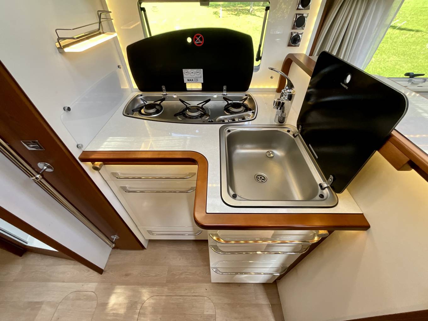 As a flagship Rapido model and at 4400kg, this Rapido also features heavy vehicle-specific features: 190L fresh water tank, 300kg-capacity garage, reinforced front suspension, AL-KO special heavy vehicle stabilising jack, ESP with Traction+, ESC. The Fiat engine is driven by a lovely automatic gearbox that is a joy to drive, particularly with the panoramic windscreen.