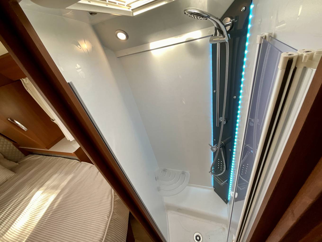 The shower cubicle, which sits separately from the washroom is a comfortable size and features LED lighting.