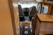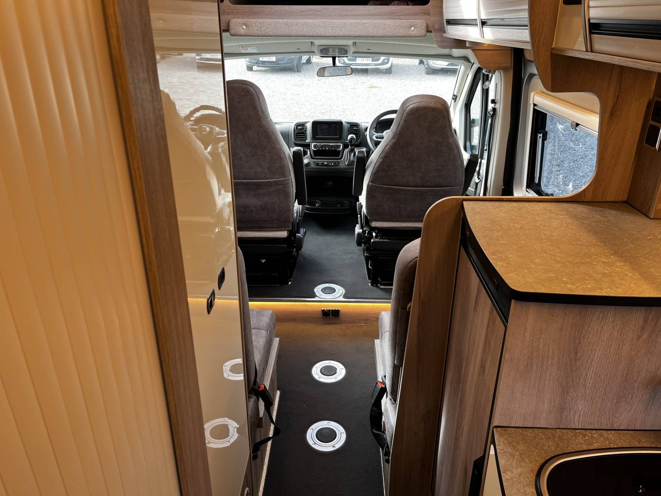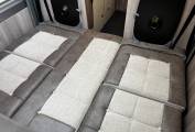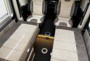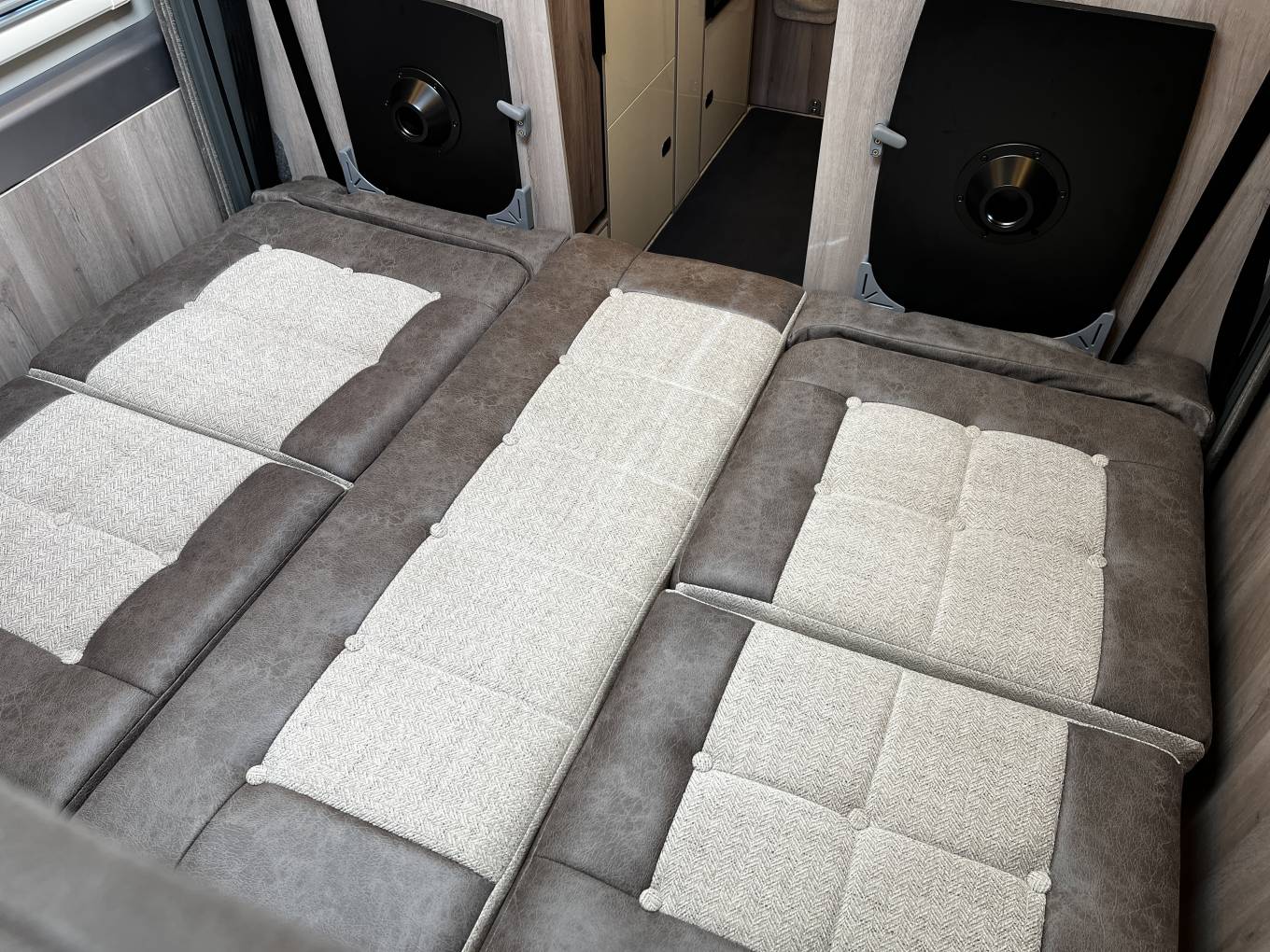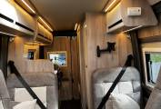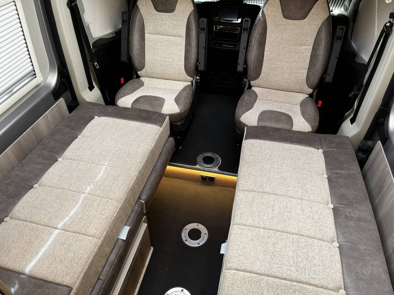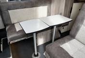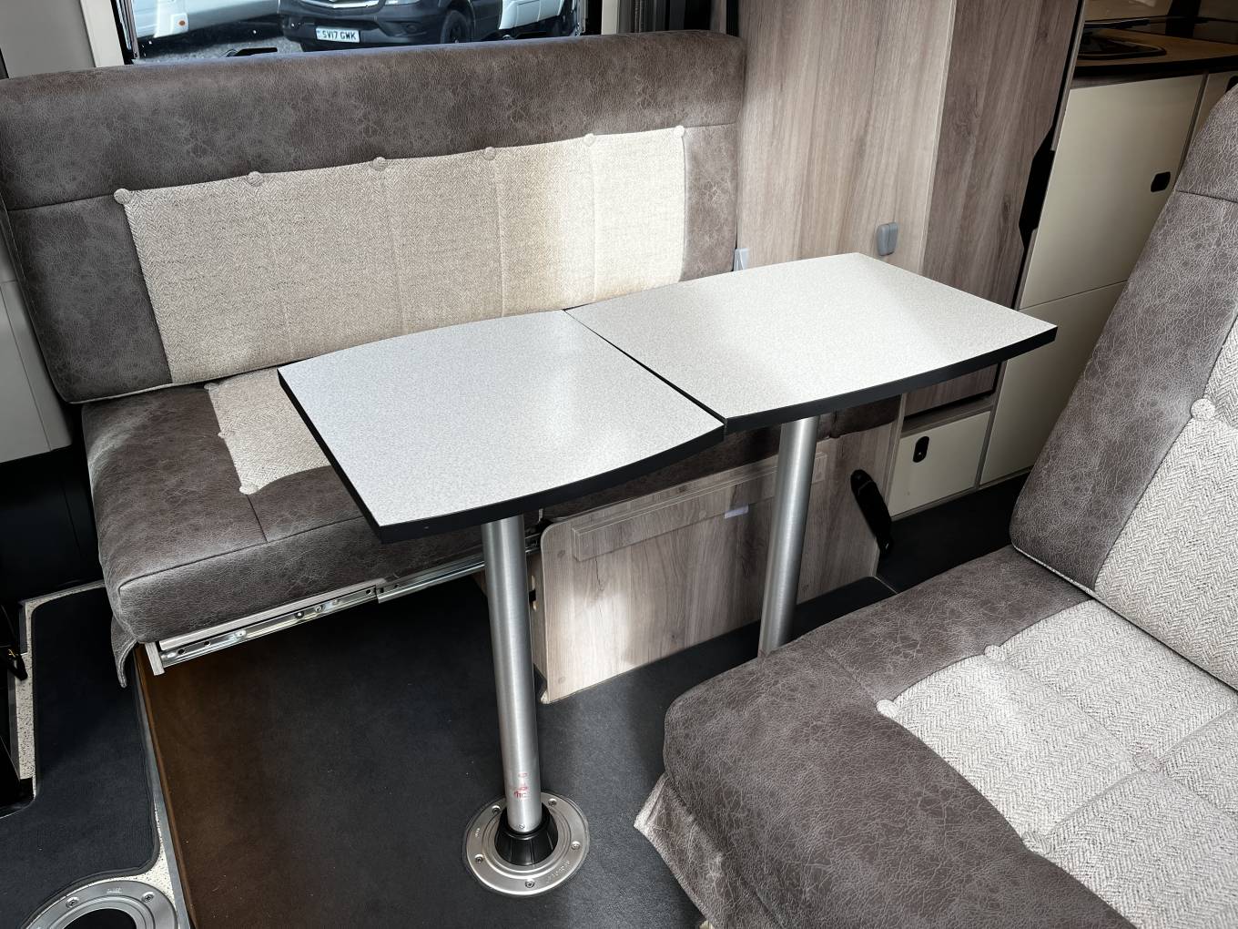 Living – A flexible configuration with side bench or forward facing seats, driver and passenger swivel bases allow for 4 people to sit. 2 different sized tables allowing you to choose how much space to use whilst dining. Plug sockets, practical storage and window blinds.