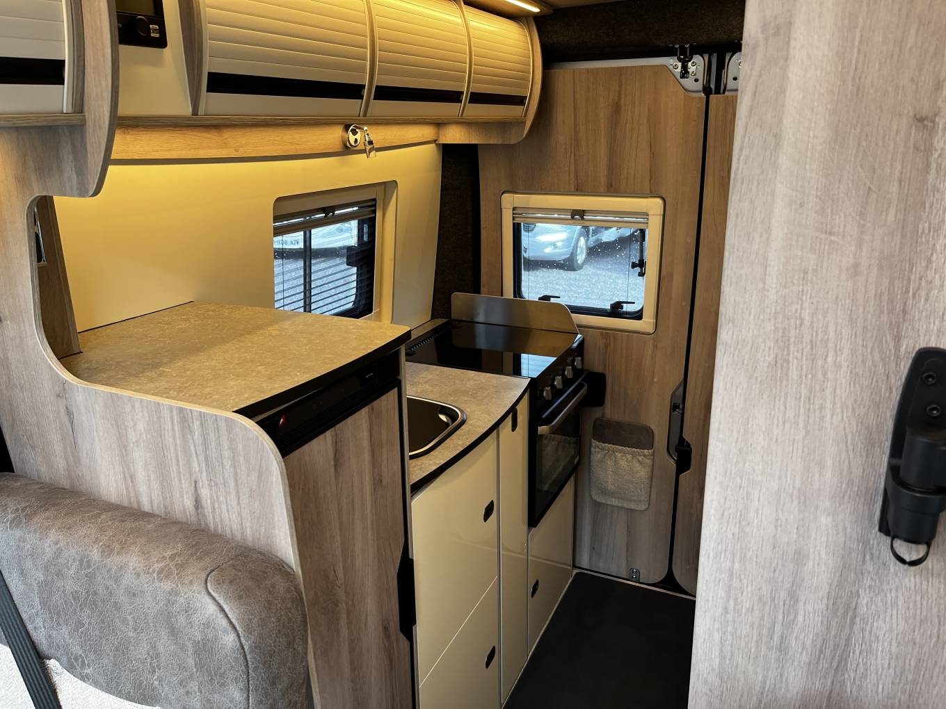 Kitchen – 3 x Burner gas hob, Oven, Grill, Sink with Hot and cold running water from a Truma combi 4e, 90 litre 12v fridge freezer, Good storage for all your kitchen needs including 240v power plugs and lighting.