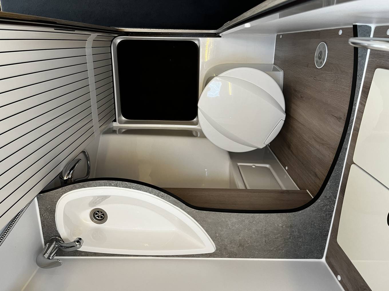Washroom - Electric flush cassette toilet – Sink – Shower with curtain.