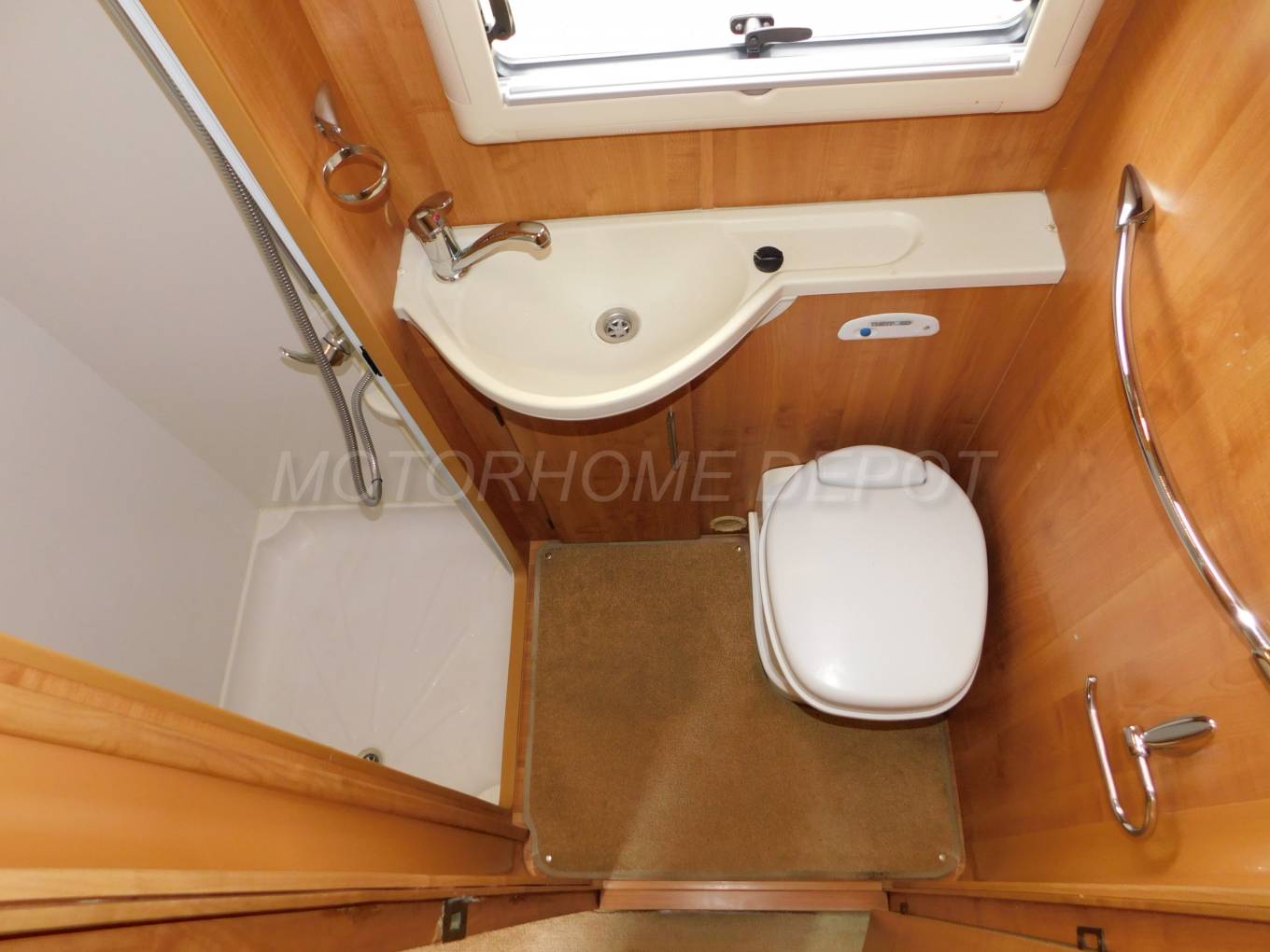 washbasin with chrome mixer tap, a Thetford cassette swivelling toilet with