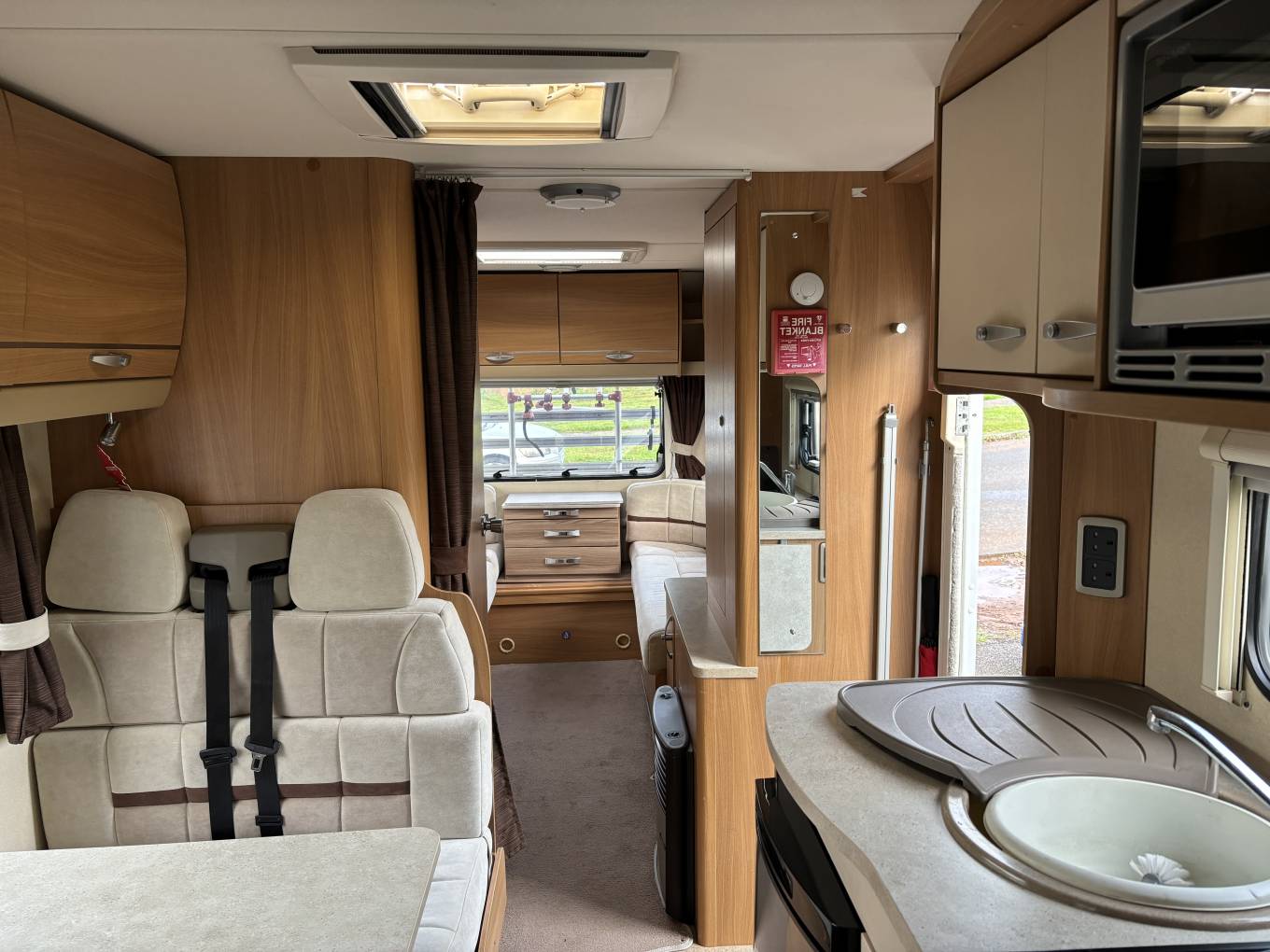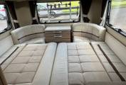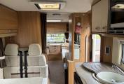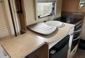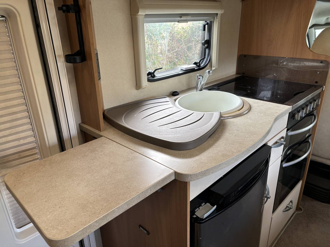 You enter the habitation area of the motorhome through a door on the passenger side of the vehicle with an electric step. To your left is the kitchen area, which has a Thetford fridge with icebox and a Thetford gas oven and gas/electric combi hob. There is a sink with mixer tap and worktop with benefits from a flip up worktop for extra space when required.