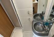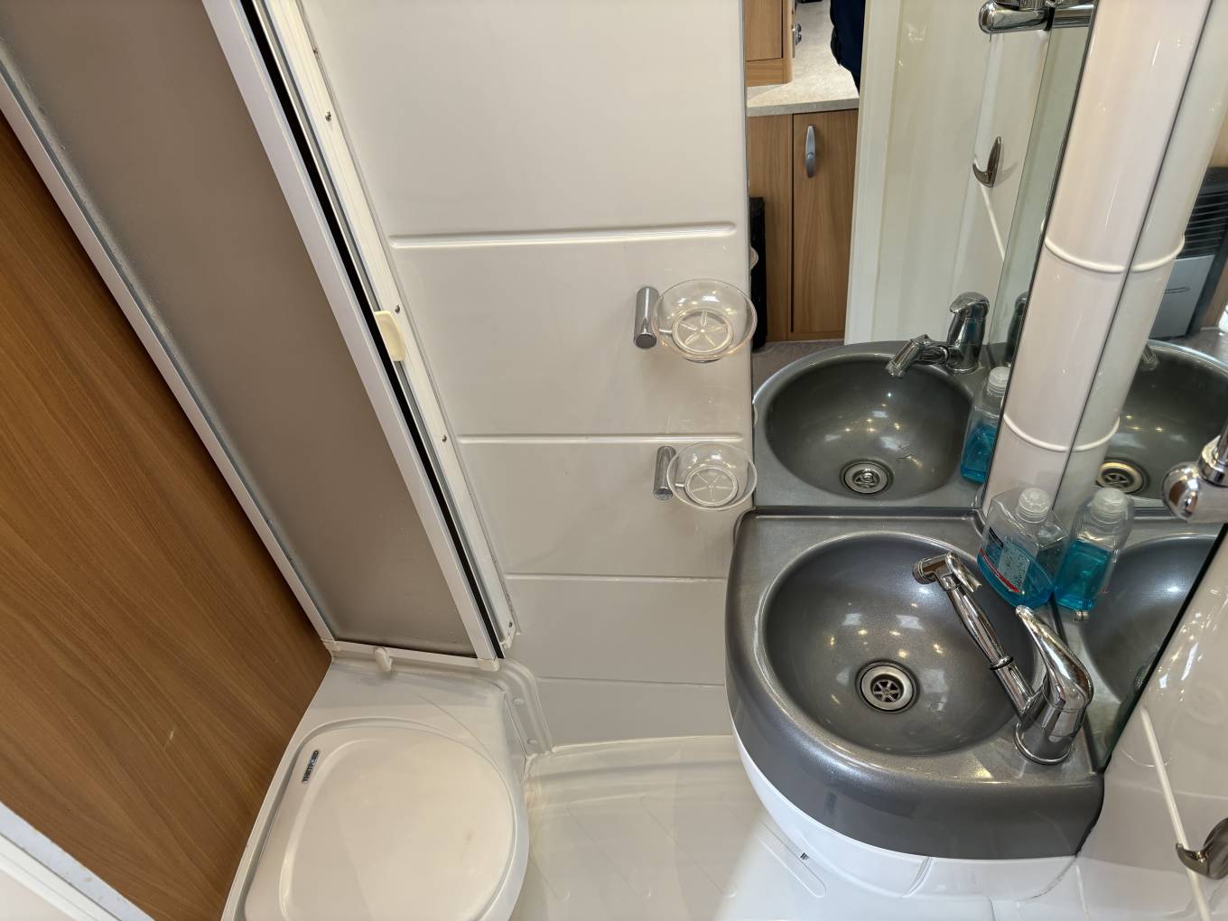 Moving to the rear of the motorhome behind the dinette is the washroom, with a 12volt flush cassette toilet, wash handbasin with double mirror behind and mixer tap which is also used in conjunction with a raiser rail to give a shower.