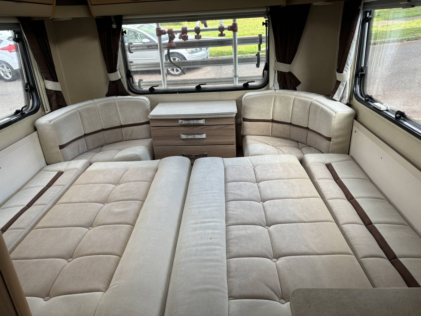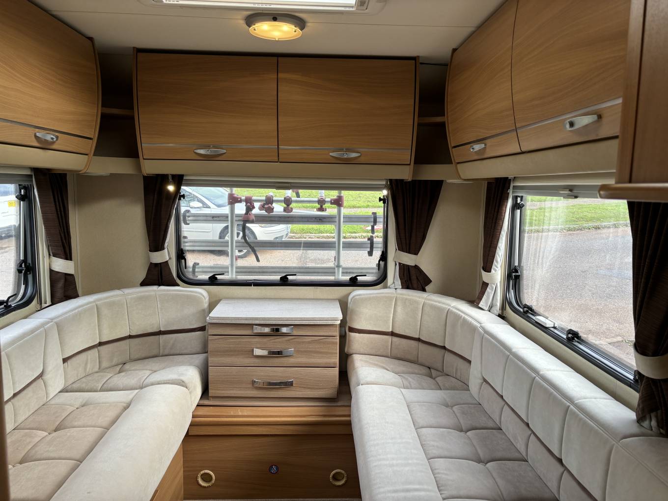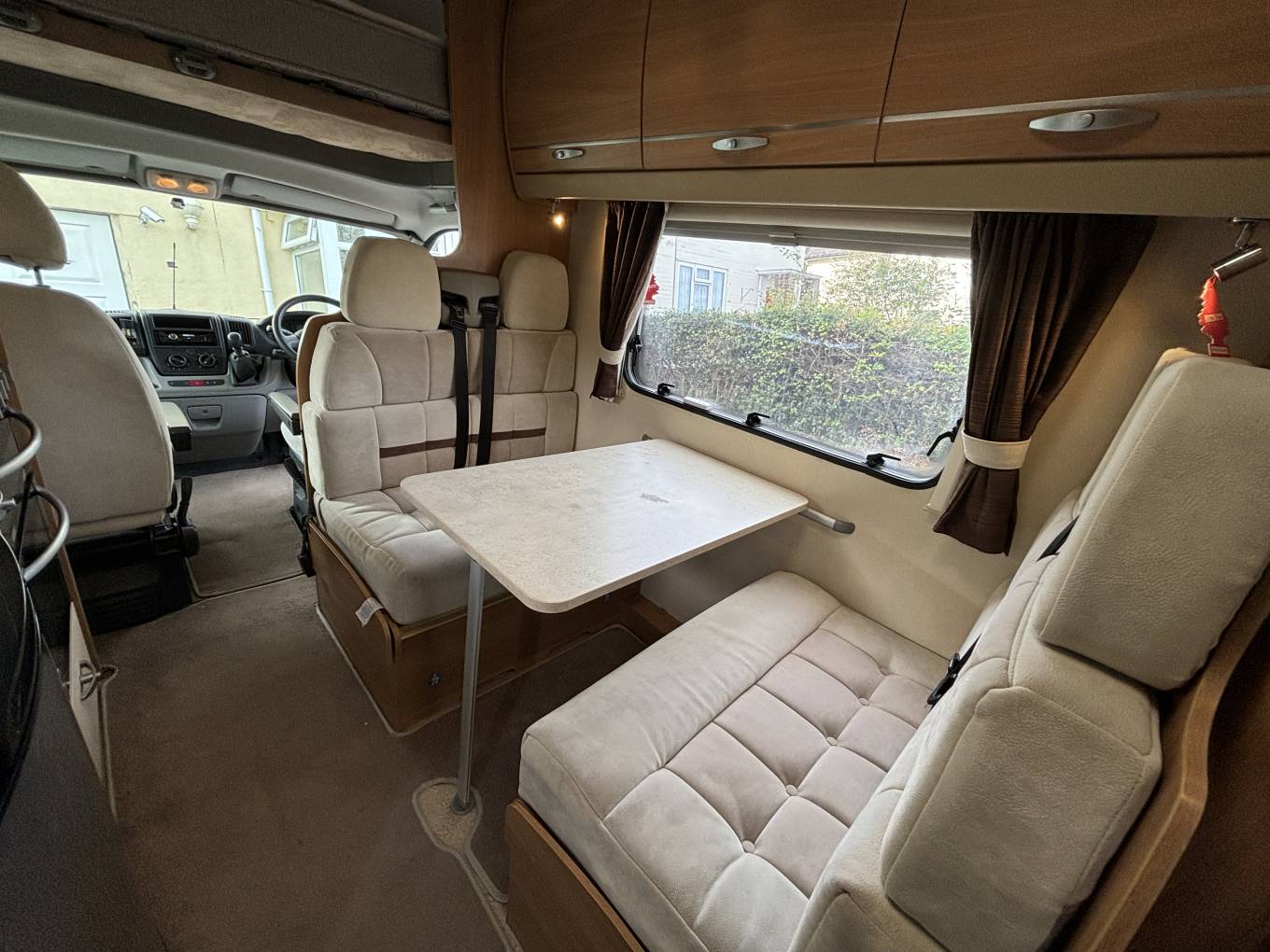 Opposite the kitchen area is the dinette with the table and rail table system which seats 4 and converts to a double bed. These seats with under storage are the belted seats which also benefit from the table while travelling. There are also 3 storage cupboards above where you will find the Sargent consumer box located.