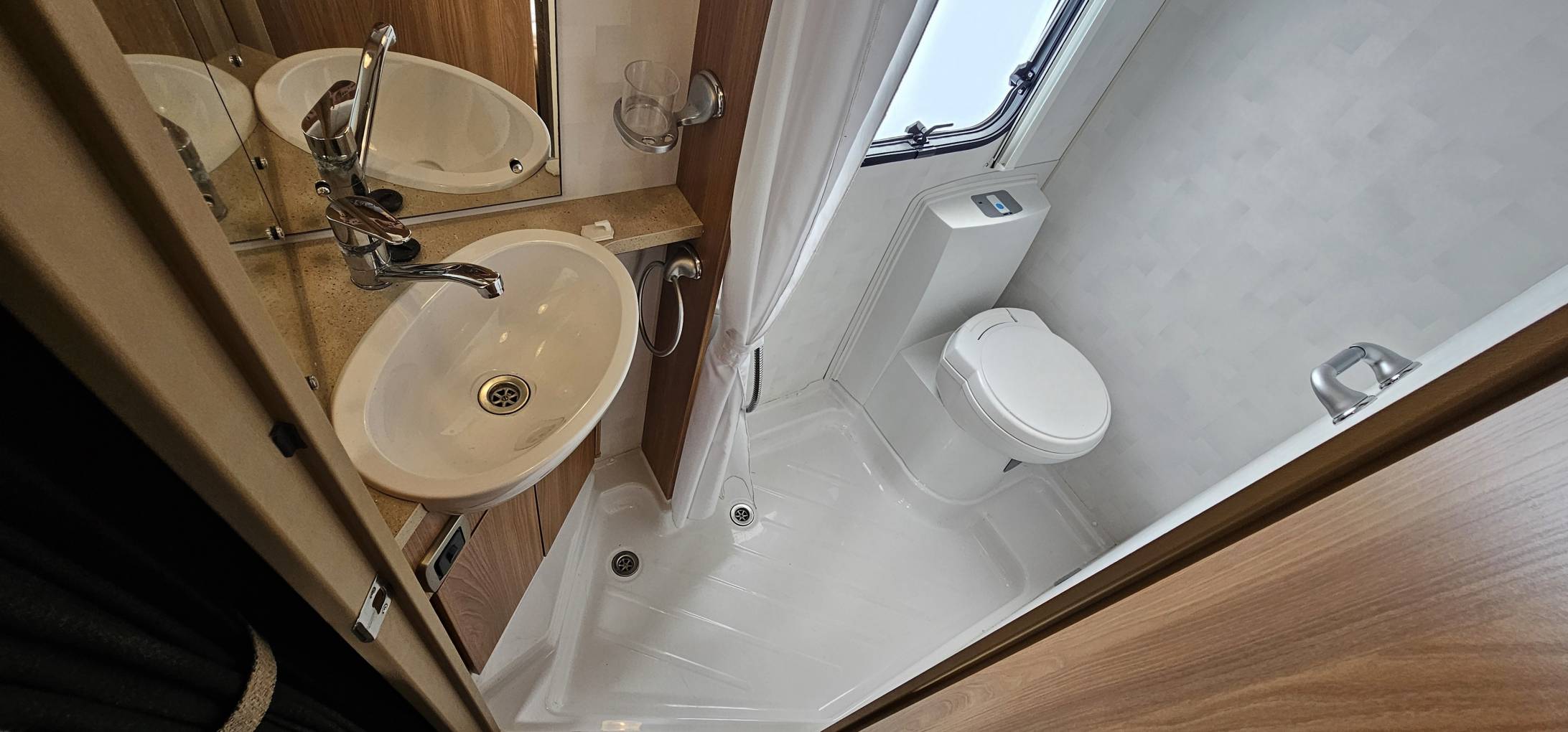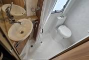 Sleeping and seating up to four, it includes two rear travel seats in the dinette and a fixed French double bed with ample storage. The washroom features a WC, washbasin, storage, and a large shower with a curtain. The kitchen is equipped with a hob, 3-way fridge, oven, and sink, with a wardrobe opposite. The front half dinette seats six using swivel cab seats and converts into a second double bed.