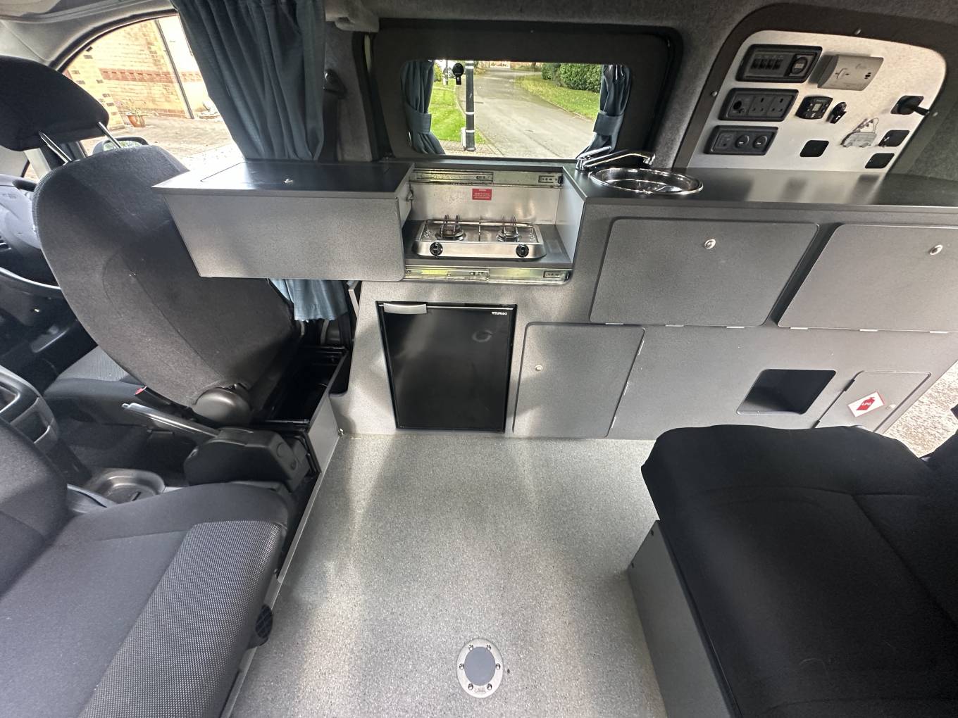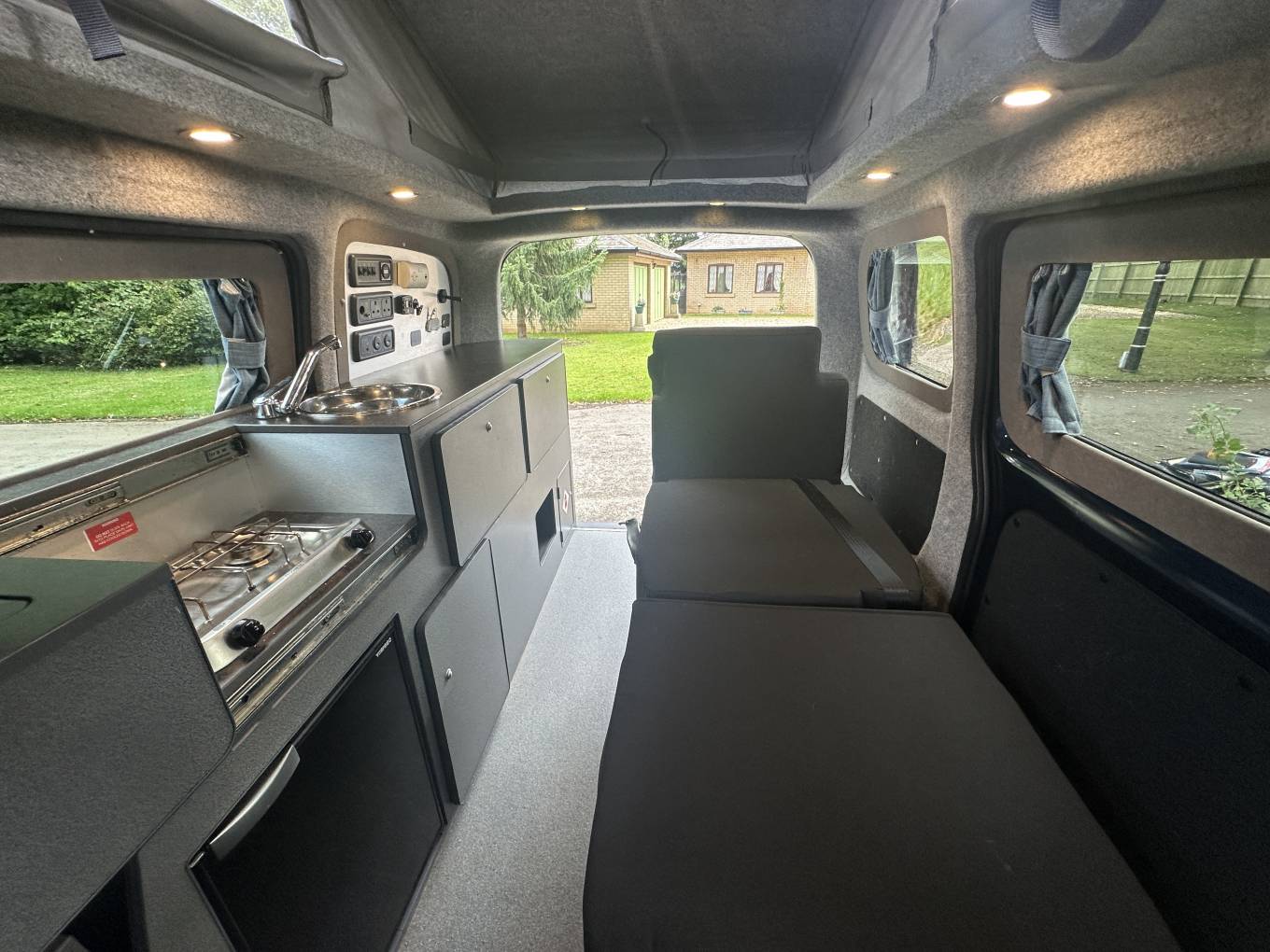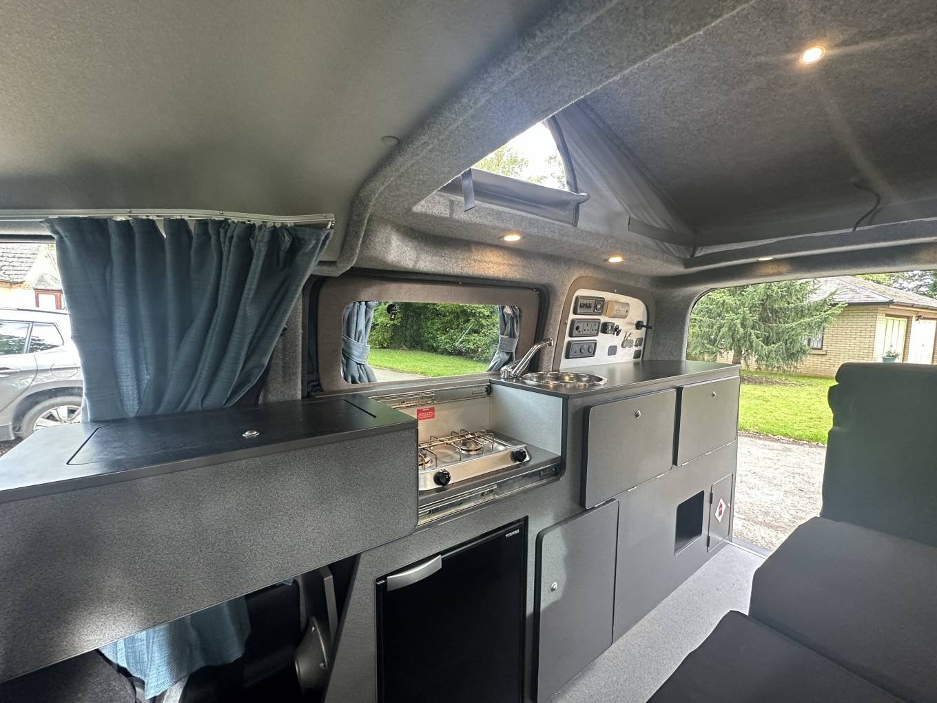 compressor fridge, sink with cold water tap, gas hob, 240 sockets, 12v